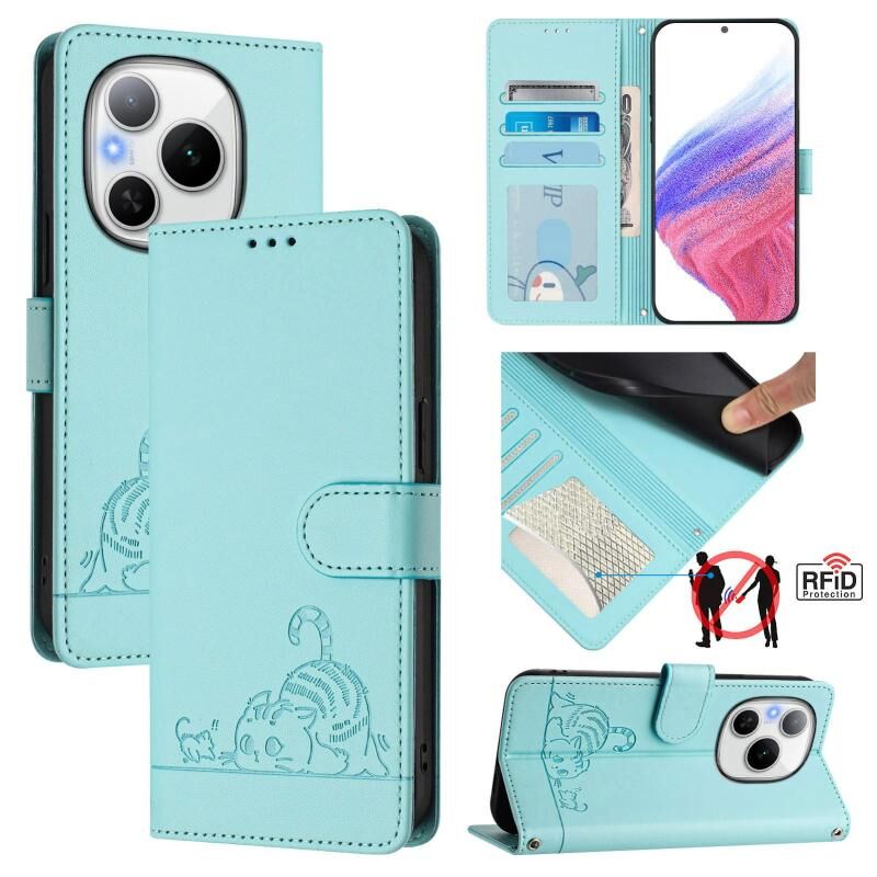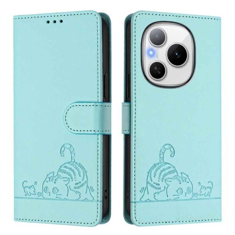 Θήκη τηλεφώνου από δέρμα με ανάγλυφο σχέδιο γάτας και κωδικό RFID, με κορδόνι, για Honor Power 5G (Μέντας Πράσινο)