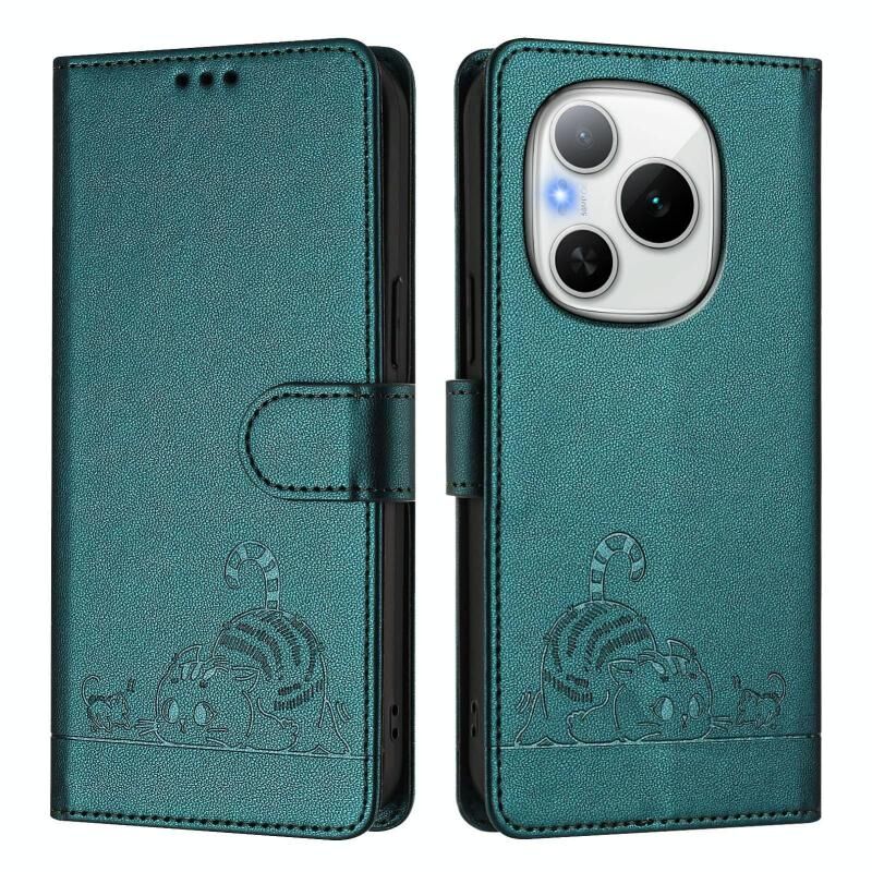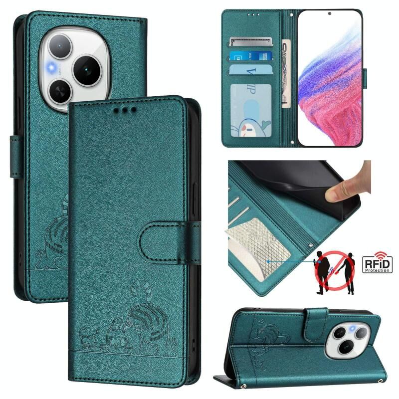 Θήκη τηλεφώνου από δέρμα με ανάγλυφο σχέδιο γάτας και κωδικό RFID, με κορδόνι, για Honor Power 5G (Μέντας Πράσινο)