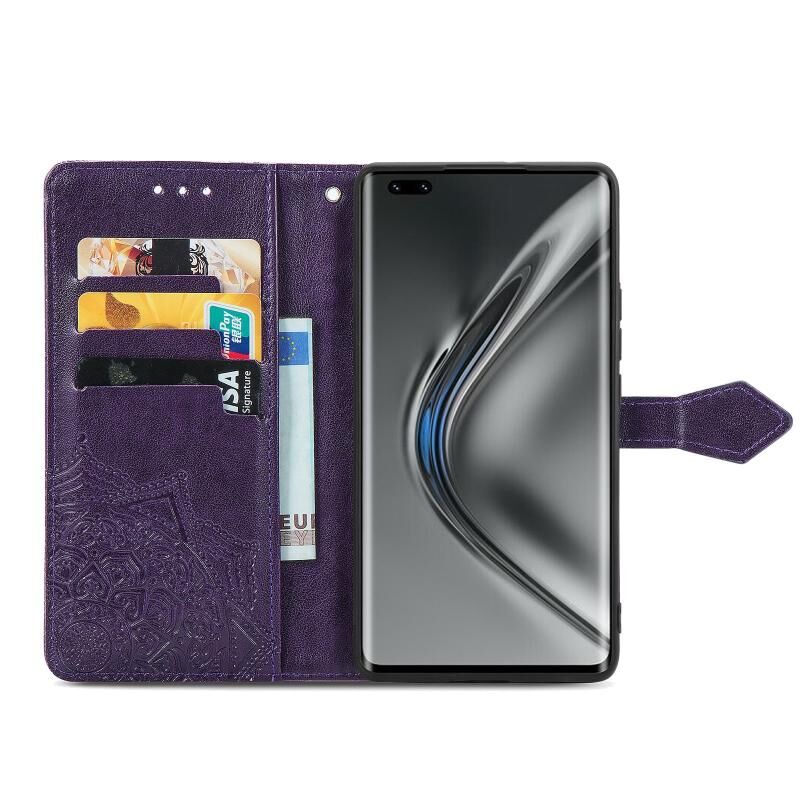 Για Honor V40 5G Mandala λουλούδι ανάγλυφο οριζόντια Flip δερμάτινη θήκη με βραχίονα / Υποδοχή κάρτας / πορτοφόλι / Lanyard (μωβ)