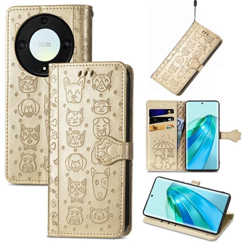 Θήκη τηλεφώνου από δέρμα με ανάγλυφα σχέδια χαριτωμένων γάτας και σκύλου για Honor X40 (Μωβ)