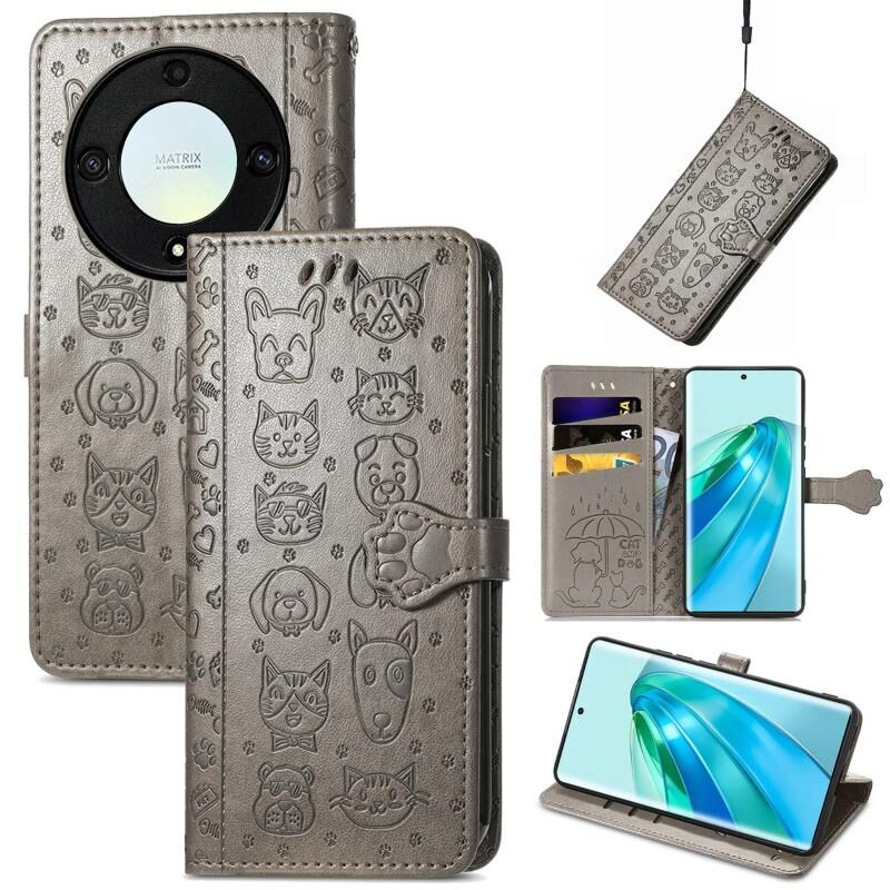 Θήκη τηλεφώνου από δέρμα με ανάγλυφα σχέδια χαριτωμένων γάτας και σκύλου για Honor X40 (Μωβ)