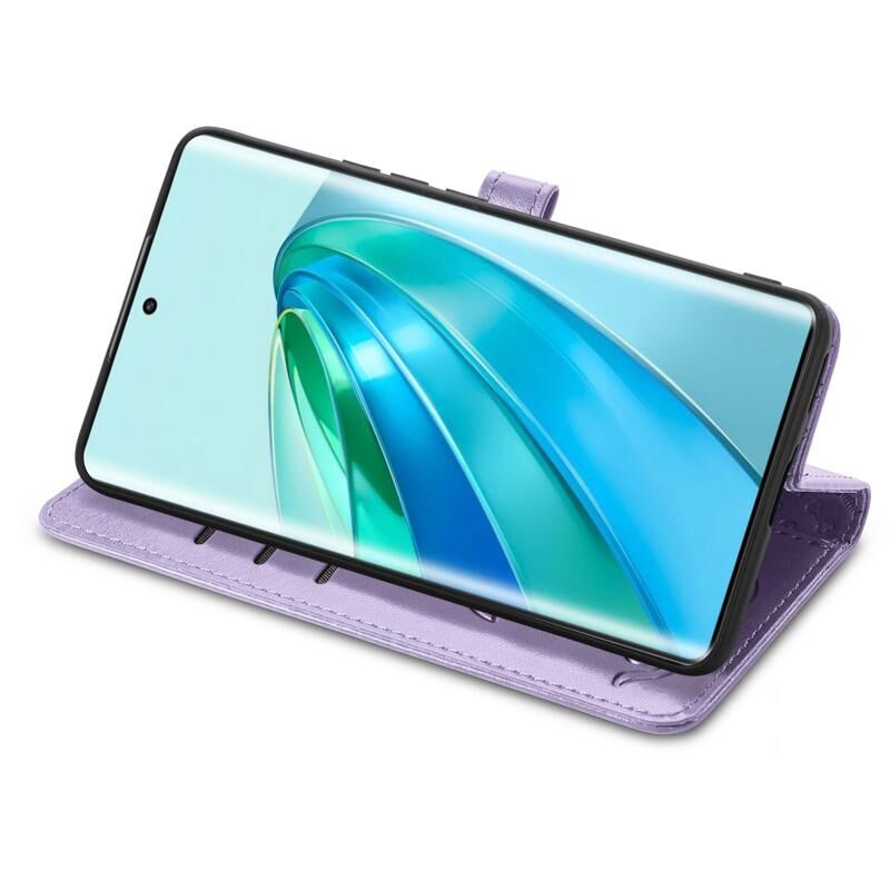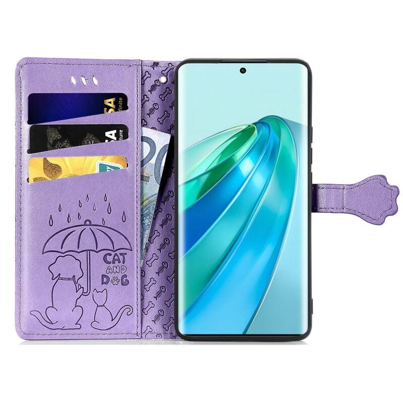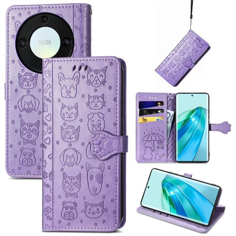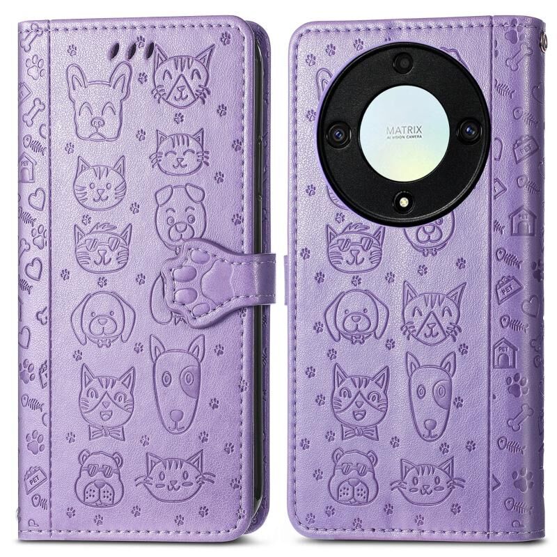 Θήκη τηλεφώνου από δέρμα με ανάγλυφα σχέδια χαριτωμένων γάτας και σκύλου για Honor X40 (Μωβ)
