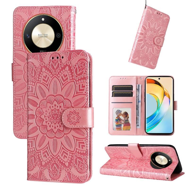 Θήκη τηλεφώνου Honor X50 με ανάγλυφο σχέδιο ηλίανθου από δέρμα (Κόκκινο)