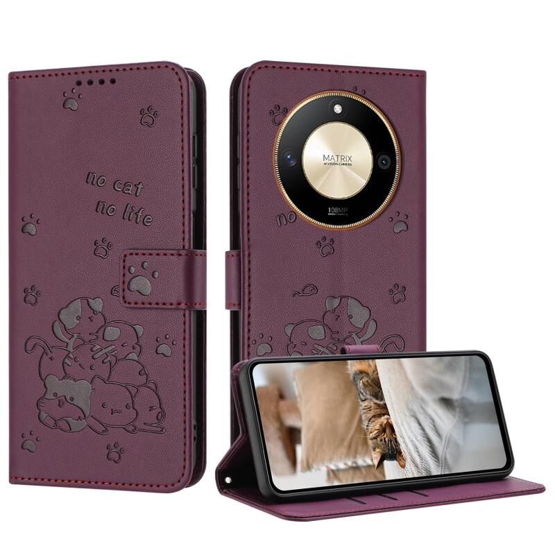 Θήκη τηλεφώνου από δέρμα με ανάγλυφο γατάκι και κορδόνι για Honor X50 / X9b (Μωβ)