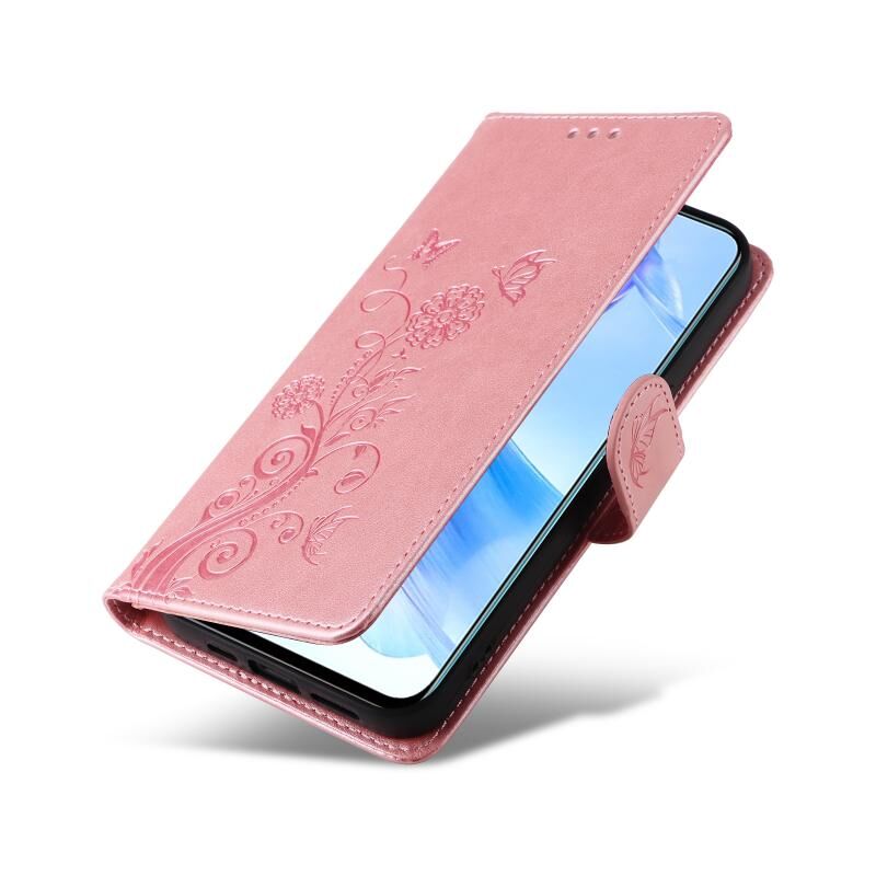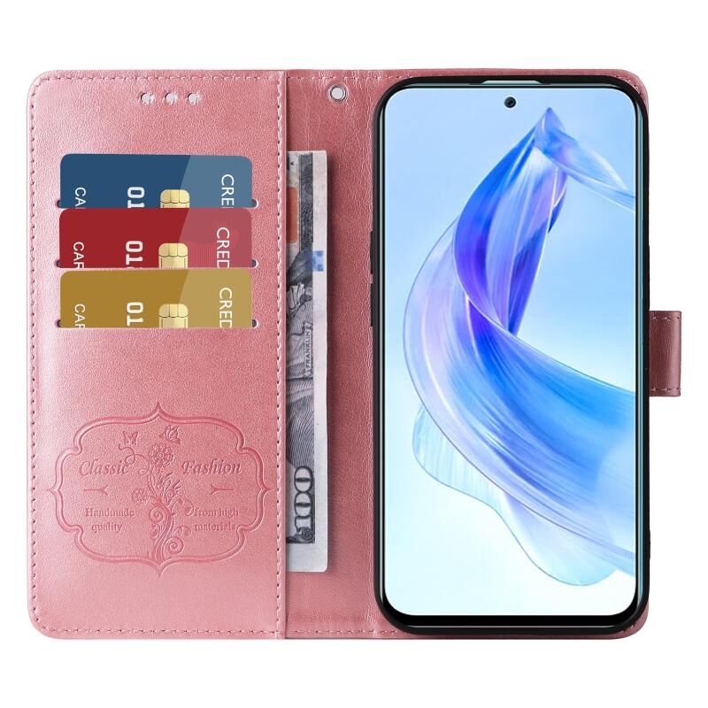 Θήκη τηλεφώνου από δέρμα με ανάγλυφα λουλούδια και πεταλούδες για Honor X50i 5G / 90 Lite (Ροζ χρυσός)