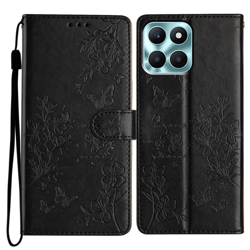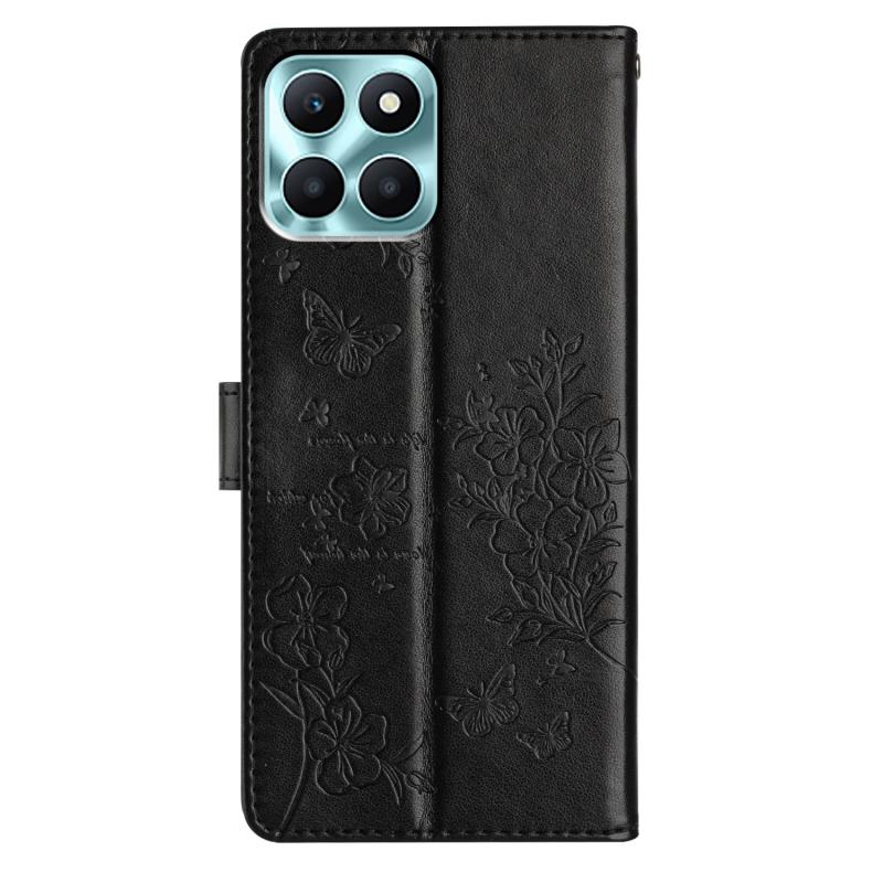 For Honor X6a Butterflies And Flowers Leather Phone Case(Black)