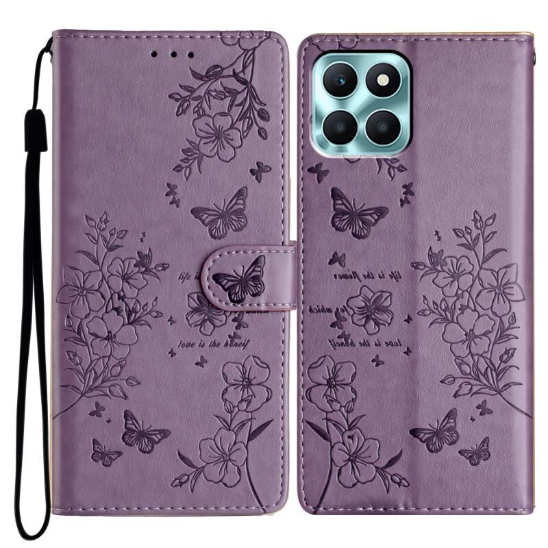 Θήκη τηλεφώνου από δέρμα για Honor X6a, με σχέδια πεταλούδες και λουλούδια (Χρυσό)