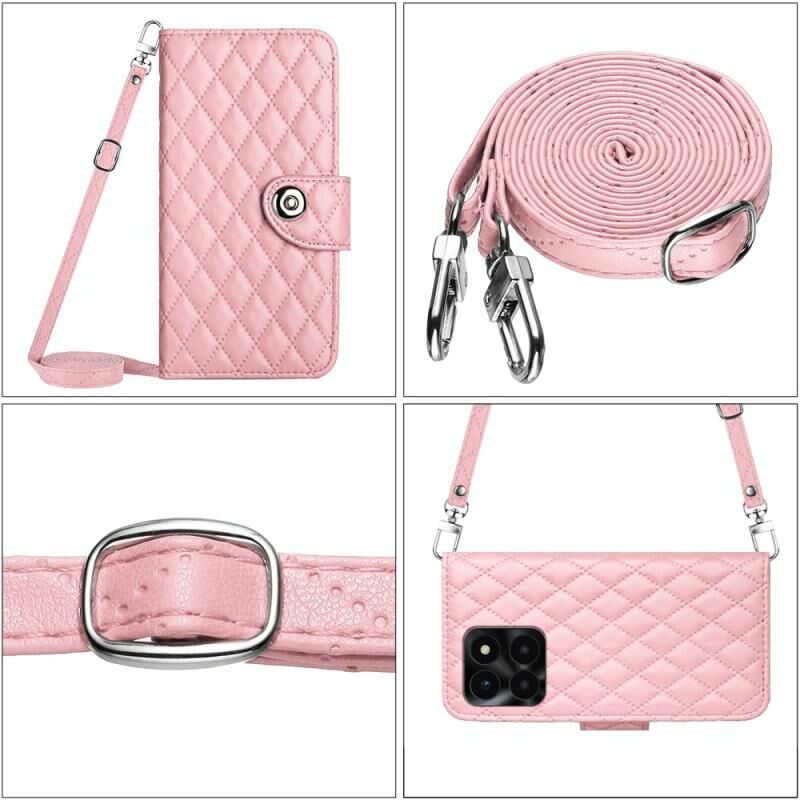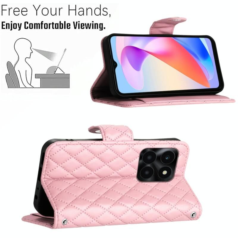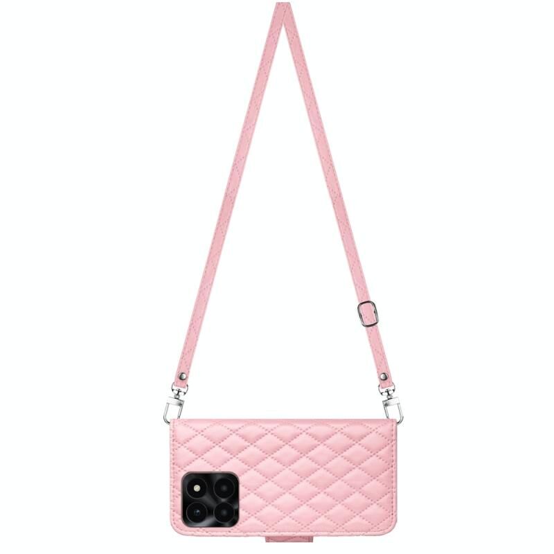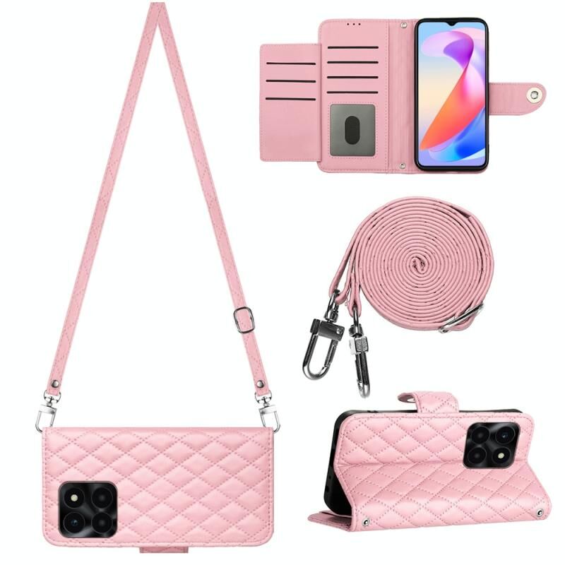 Για Honor X6a Rhombic υφή Flip δερμάτινη θήκη τηλεφώνου με μακρύ κορδόνι (ροζ)
