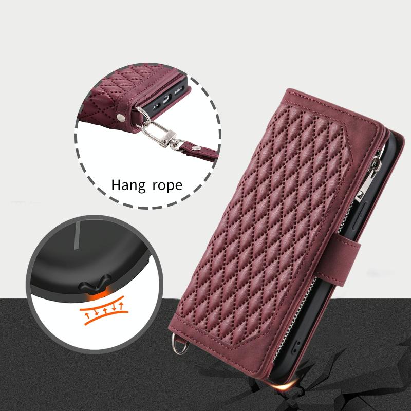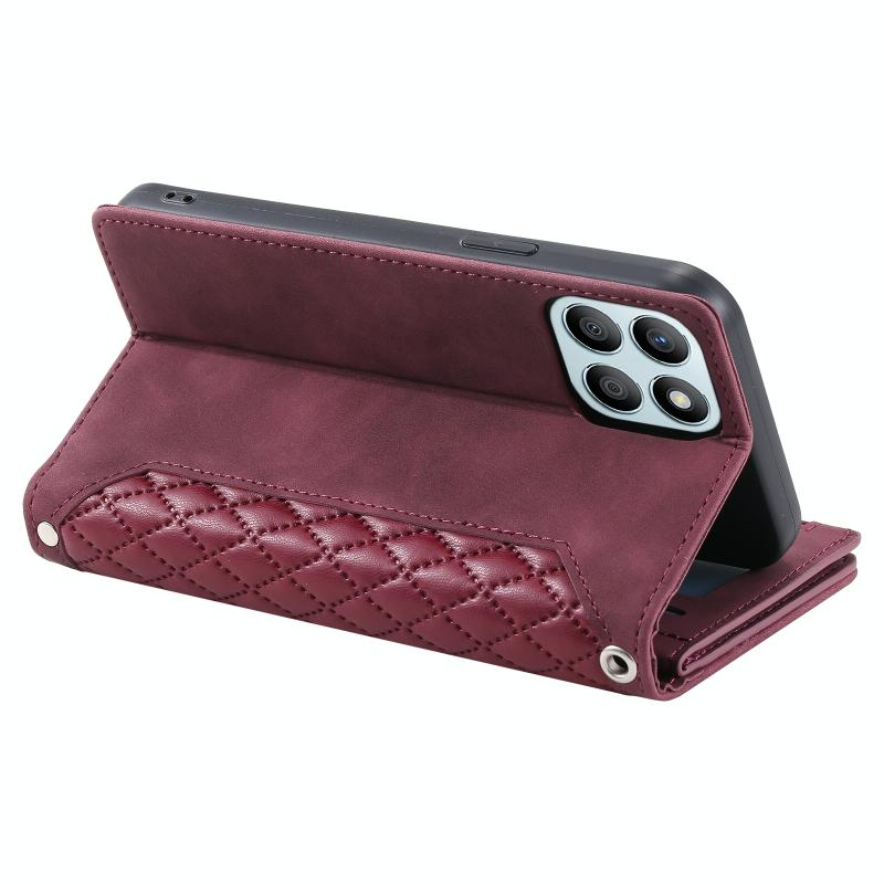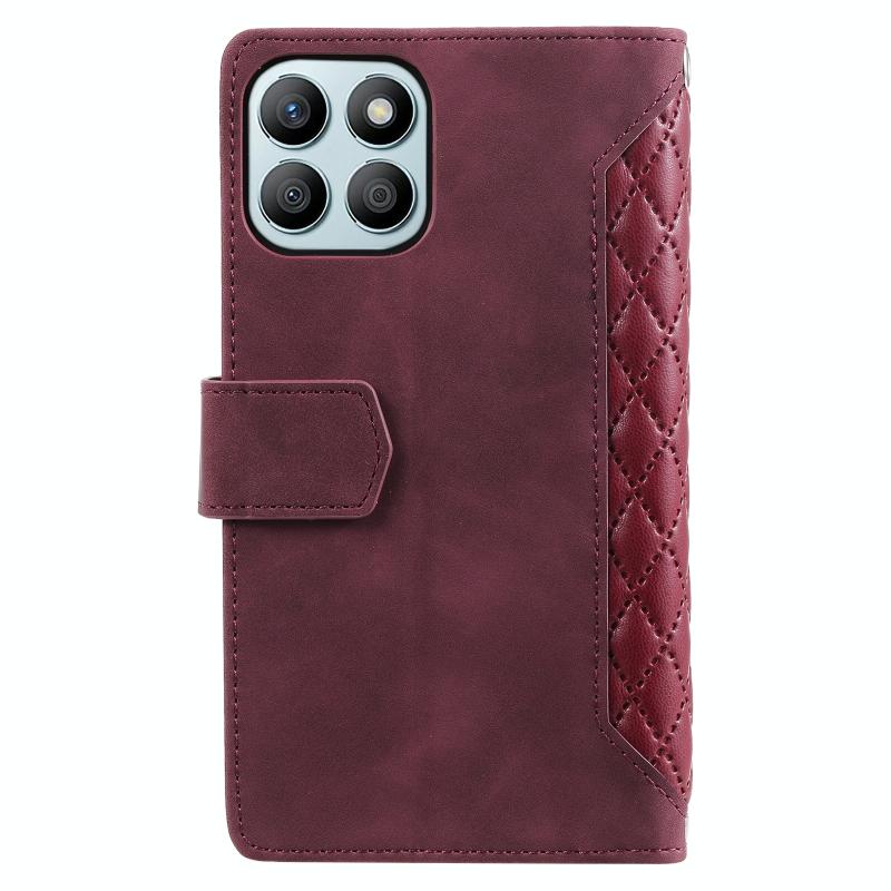 For Honor X6b 4G Global Grid Texture Zipper Leather Phone Case with Lanyard(Wine Red)