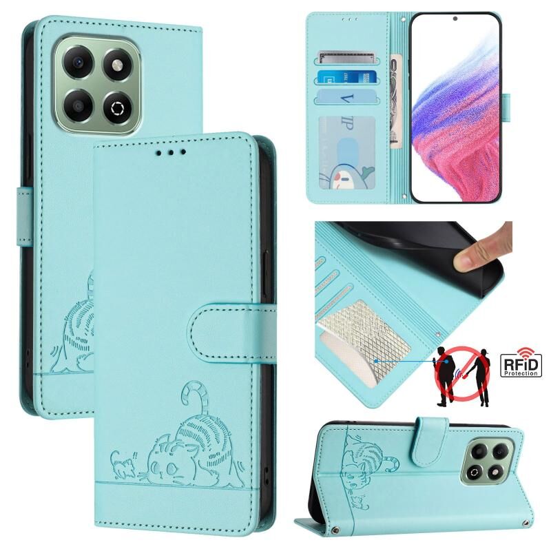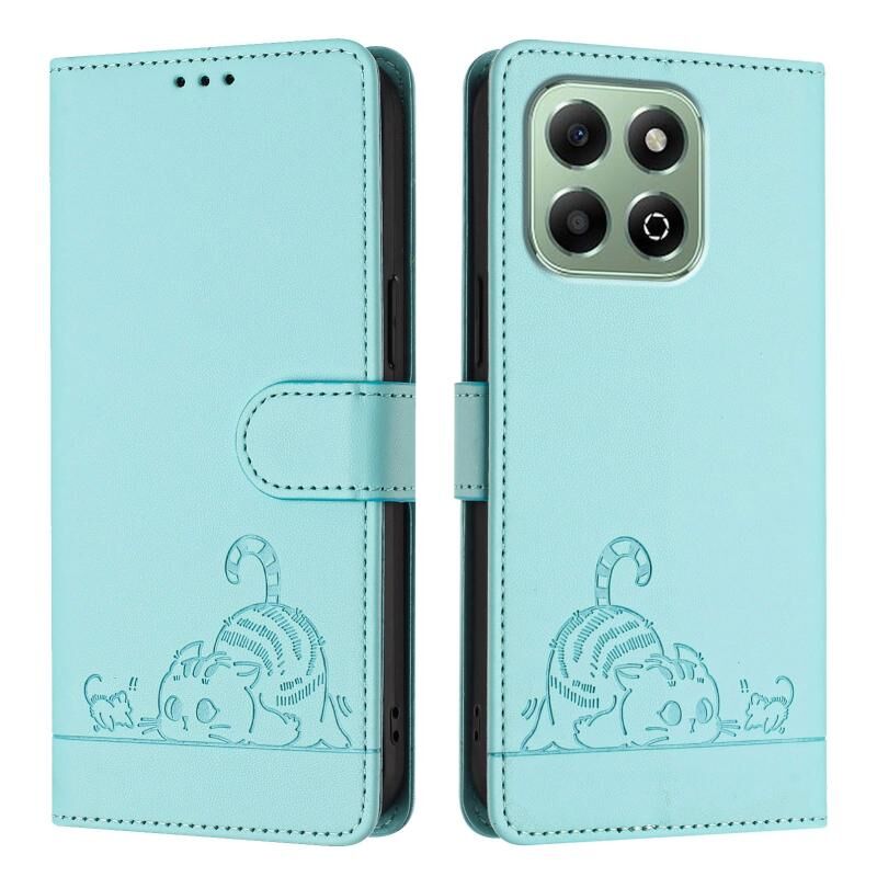 Θήκη τηλεφώνου από δέρμα με ανάγλυφο σχέδιο γάτας και ποντικού για Honor X6b, με κορδόνι (Μέντας Πράσινο)