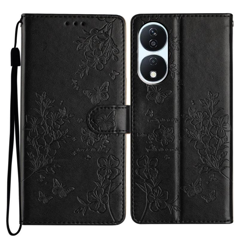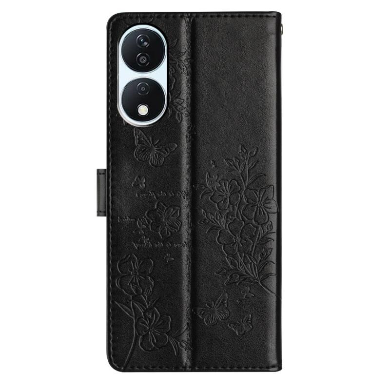 Θήκη τηλεφώνου από δέρμα για Honor X7b, με σχέδια πεταλούδες και λουλούδια (Μαύρο)