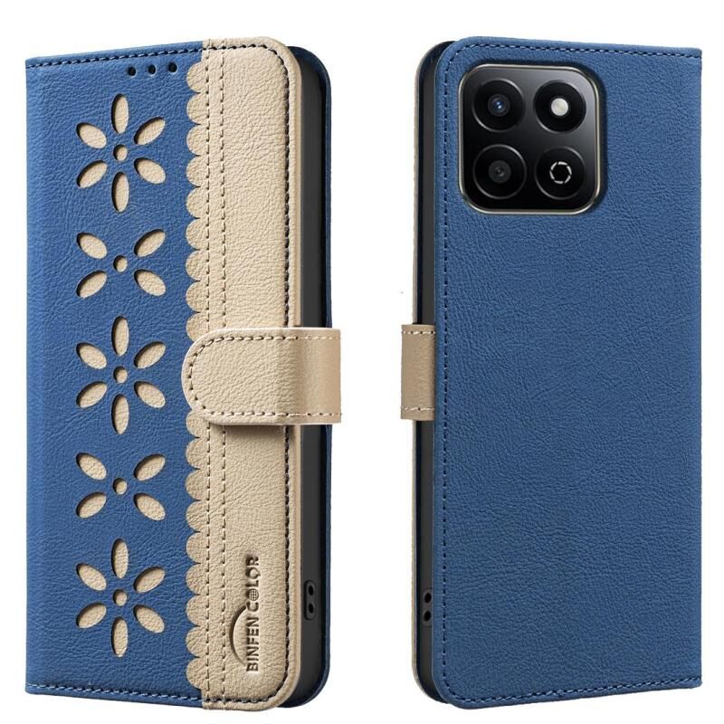 Θήκη τηλεφώνου από δέρμα με σχέδιο κοίλου λουλουδιού σε χρώματα patchwork RFID για Honor X7C / 200 Smart 5G (Μαύρο)