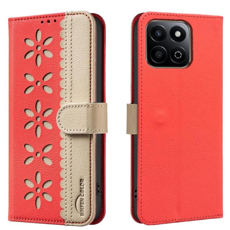 Θήκη τηλεφώνου από δέρμα με σχέδιο κοίλου λουλουδιού σε χρώματα patchwork RFID για Honor X7C / 200 Smart 5G (Κόκκινο)