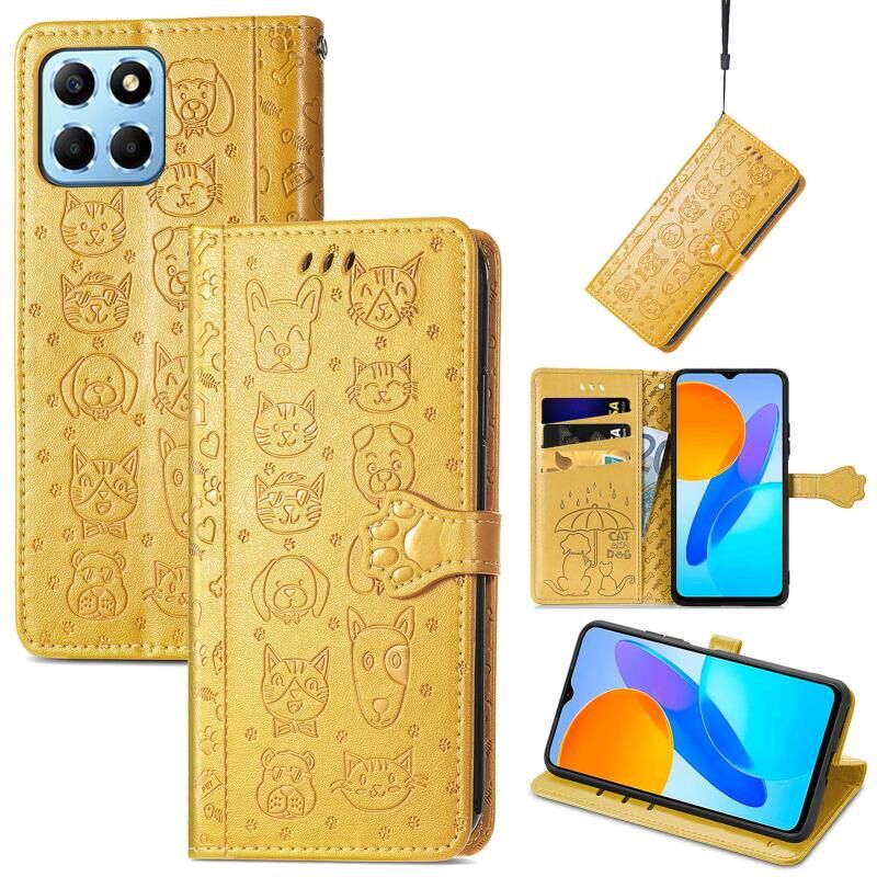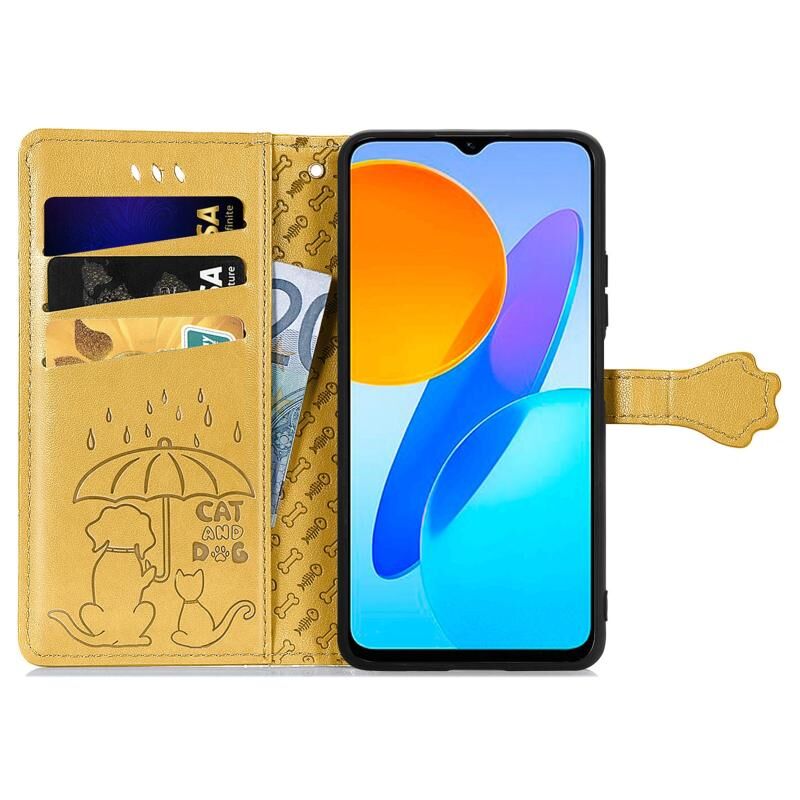 Θήκη τηλεφώνου από δέρμα με ανάγλυφα σχέδια χαριτωμένων γάτας και σκύλου για Honor X8 5G (Κίτρινο)