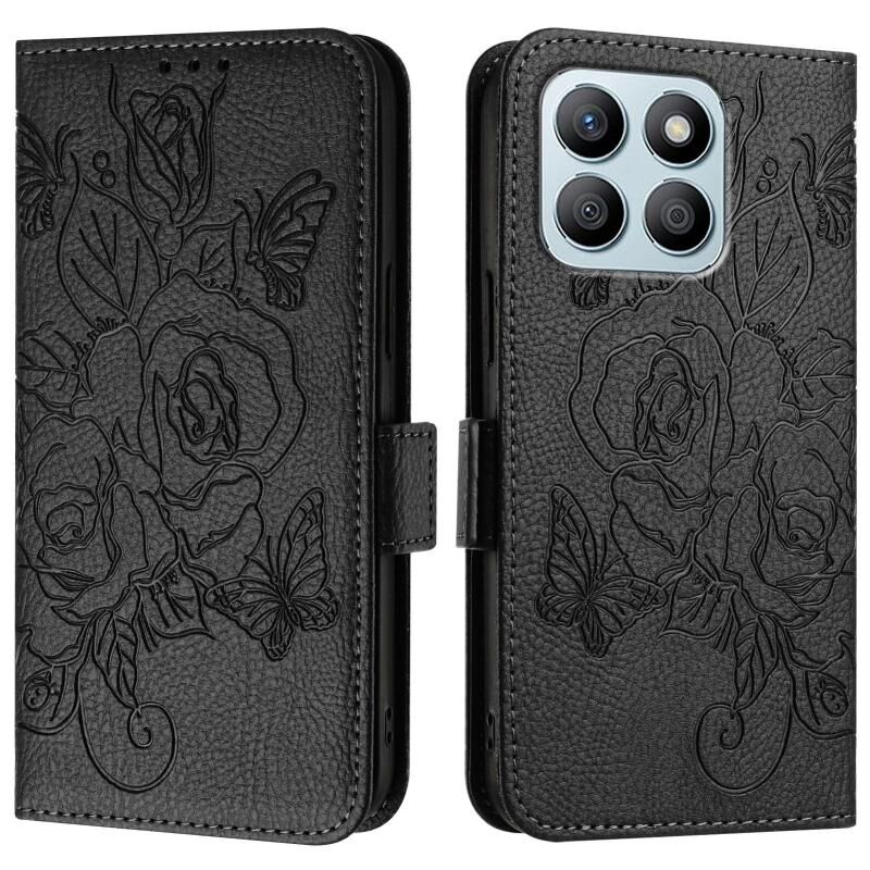 Θήκη τηλεφώνου από δέρμα με ανάγλυφο σχέδιο τριαντάφυλλου και προστασία RFID κατά της κλοπής για Honor X8b 4G (Μαύρο)