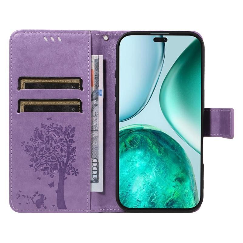 Θήκη τηλεφώνου από δέρμα με σχέδιο ανάγλυφου δέντρου & γάτας για Honor X8C 4G Global (ανοιχτό μωβ)