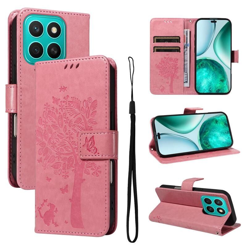 Θήκη τηλεφώνου από δέρμα με σχέδιο ανάγλυφου δέντρου & γάτας για Honor X8C 4G Global (Ροζ)