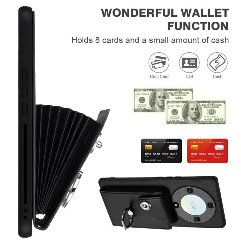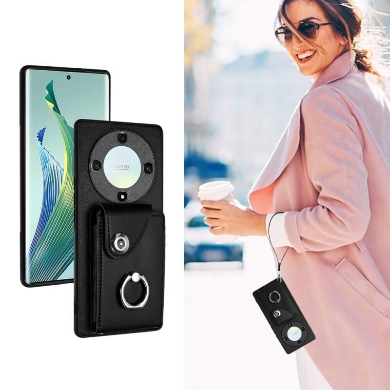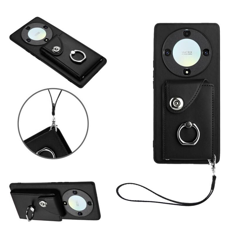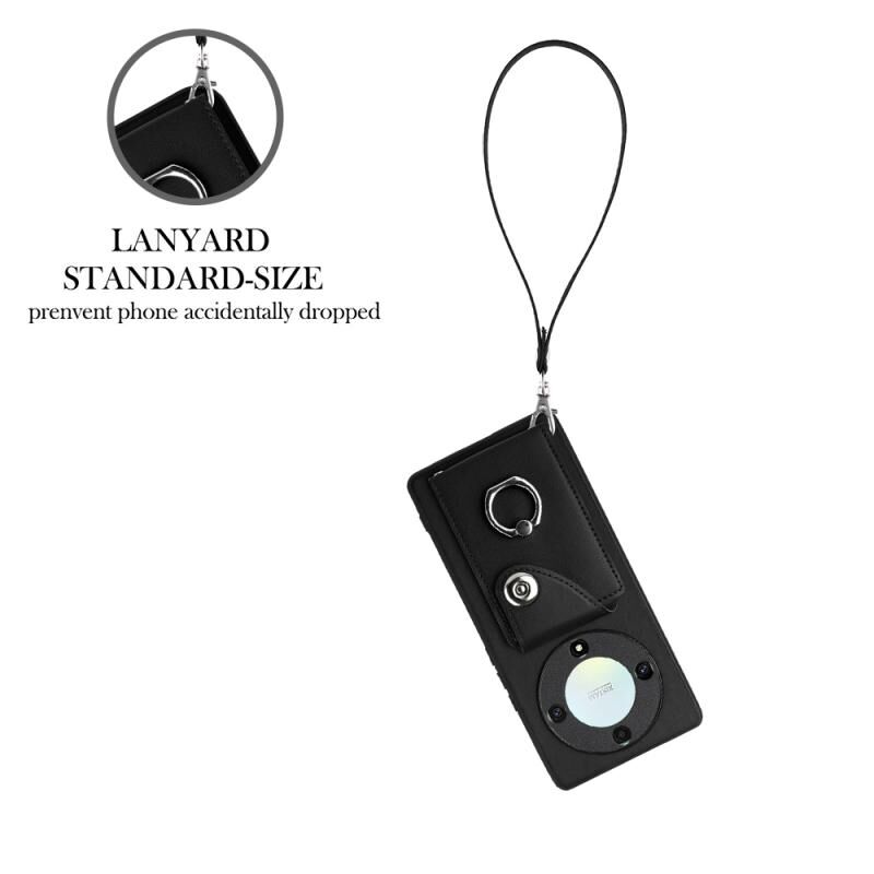Για Honor X9a/Magic5 Lite Οργάνων κάρτα τσάντα δαχτυλίδι κάτοχος PU τηλέφωνο υπόθεση με κορδόνι (Μαύρο)