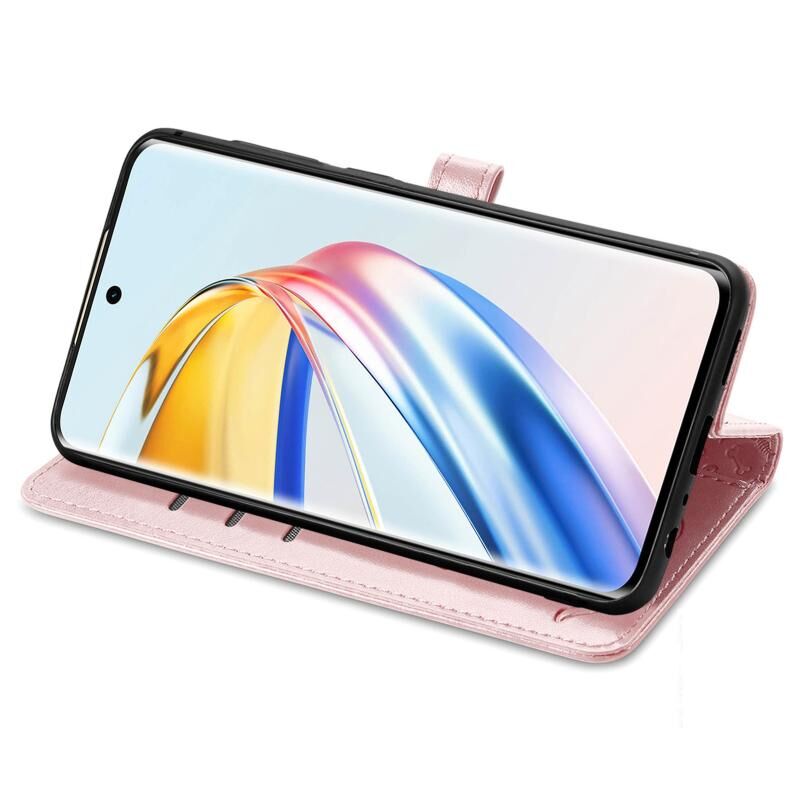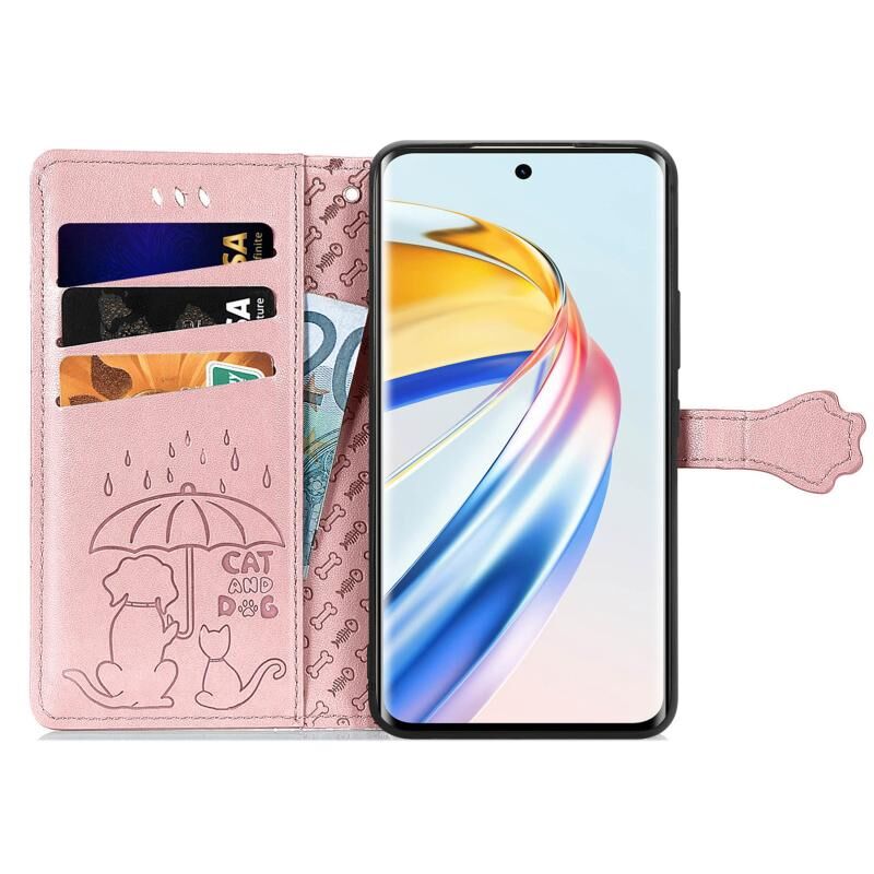 Θήκη τηλεφώνου Honor X9b με ανάγλυφο σχέδιο γάτας και σκύλου από δέρμα (Χρυσορόδινο)