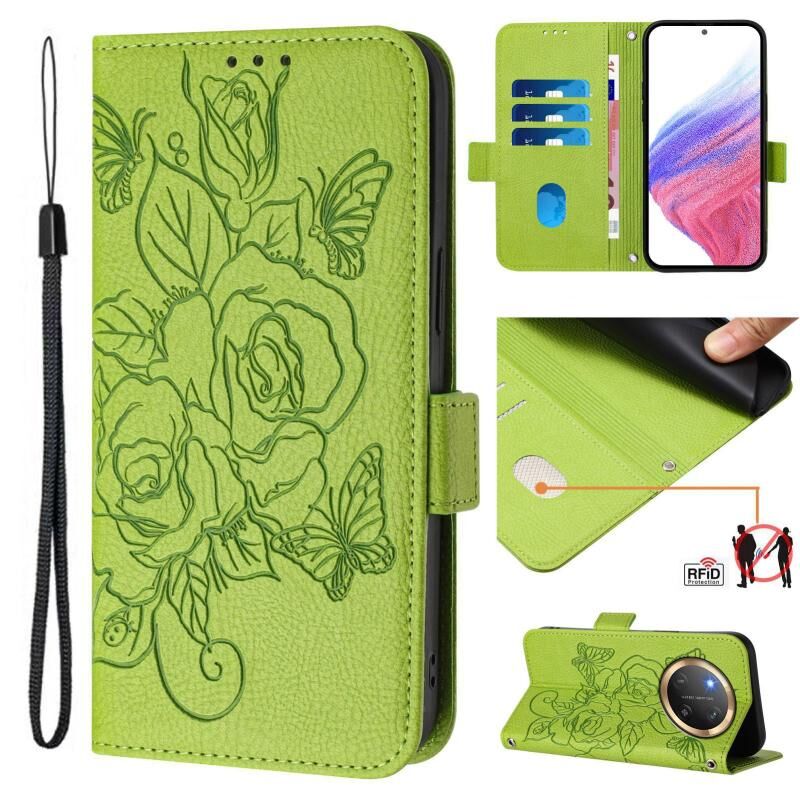 Θήκη τηλεφώνου δερμάτινη με ανάγλυφο σχέδιο τριαντάφυλλου και προστασία RFID κατά της κλοπής για Honor X9c 5G (Πράσινο)