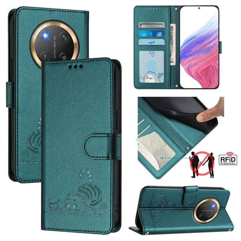Θήκη τηλεφώνου από δέρμα με ανάγλυφο σχέδιο γάτας και κατσαρίδας για Honor X9c 5G Global, με προστασία RFID και κορδόνι (Μαύρο)