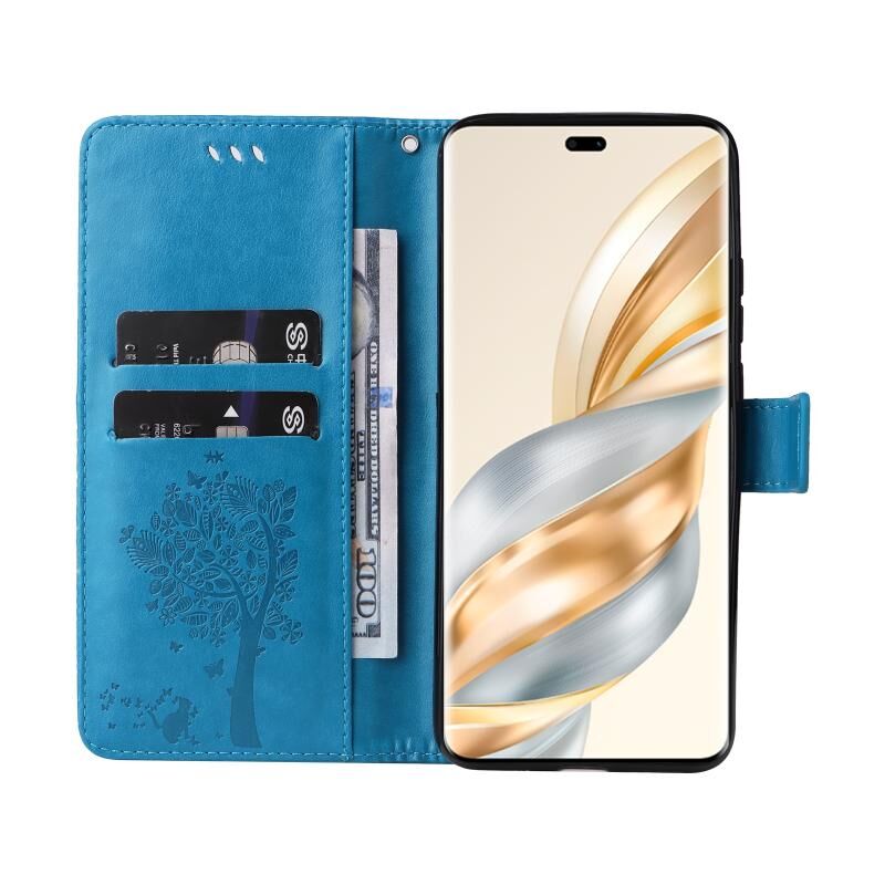 Θήκη τηλεφώνου από δέρμα με σχέδιο ανάγλυφου δέντρου & γάτας για Honor X9C 5G (Μπλε)