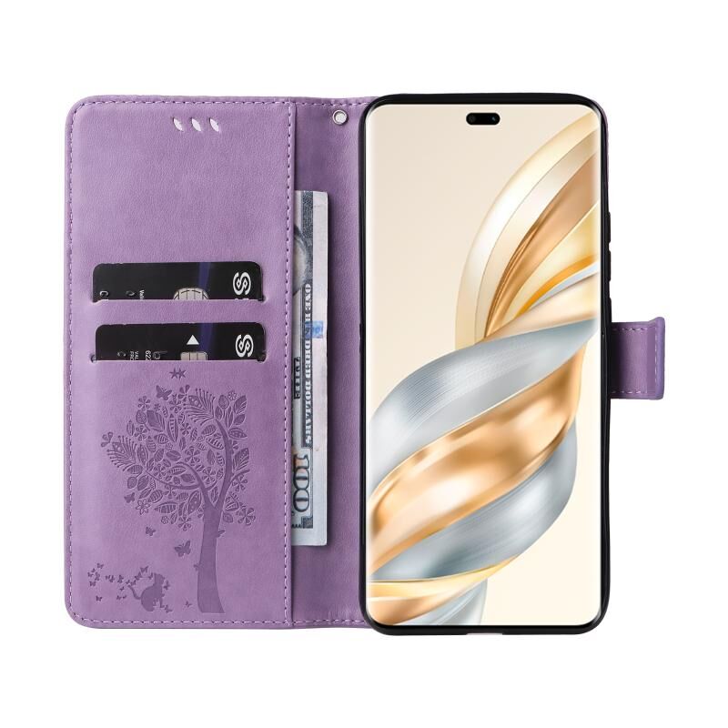 Θήκη τηλεφώνου από δέρμα με σχέδιο ανάγλυφου δέντρου & γάτας για Honor X9C 5G (Ροζ)
