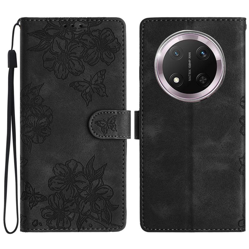 For Honor X9c Cherry Blossom Butterfly Skin Feel Embossed PU Phone Case(Black)
