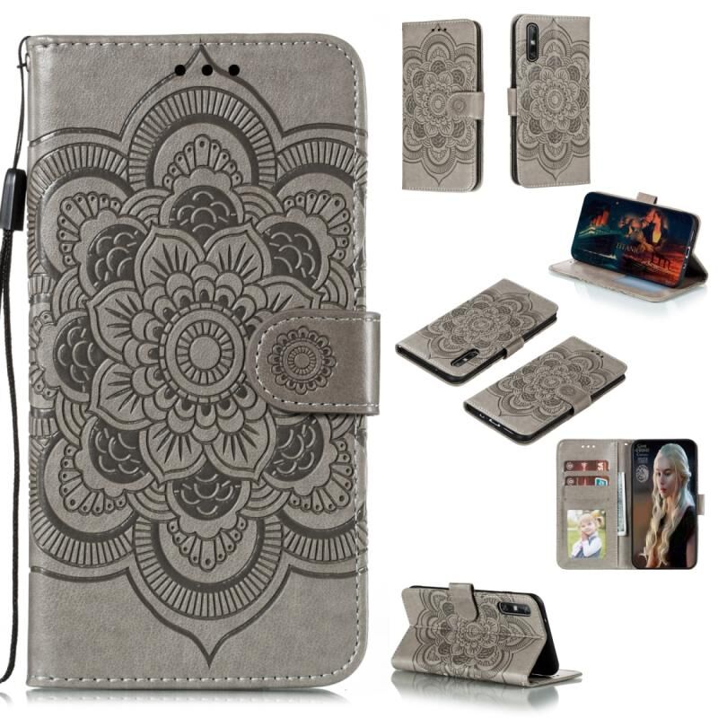 Για Huawei Enjoy 10e Mandala ανάγλυφο μοτίβο οριζόντια Flip PU δερμάτινη θήκη με κάτοχο & υποδοχές για κάρτες & Walle & Lanyard (γκρι)