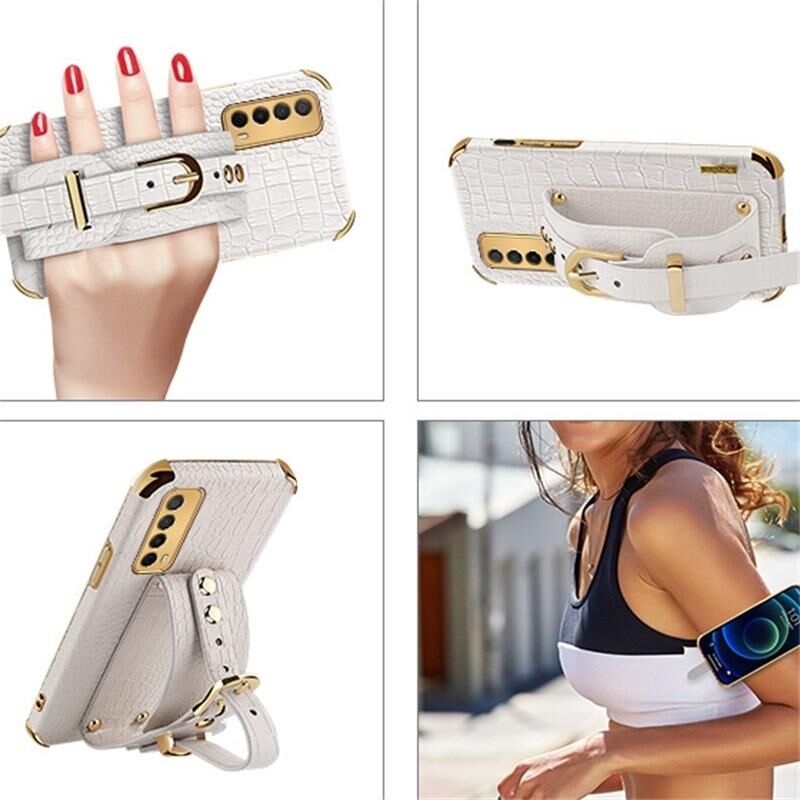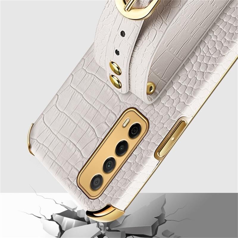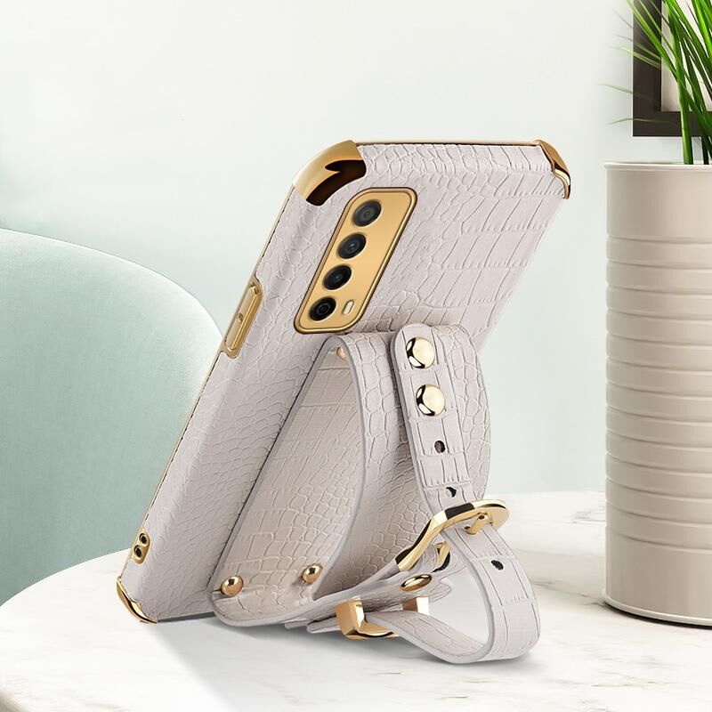 Θήκη για Huawei Enjoy 20 SE με Επικάλυψη Ηλεκτρολυτικής Επεξεργασίας, Δερμάτινη με Υφή Κροκόδειλου και Λουρί Χεριού (Λευκό)