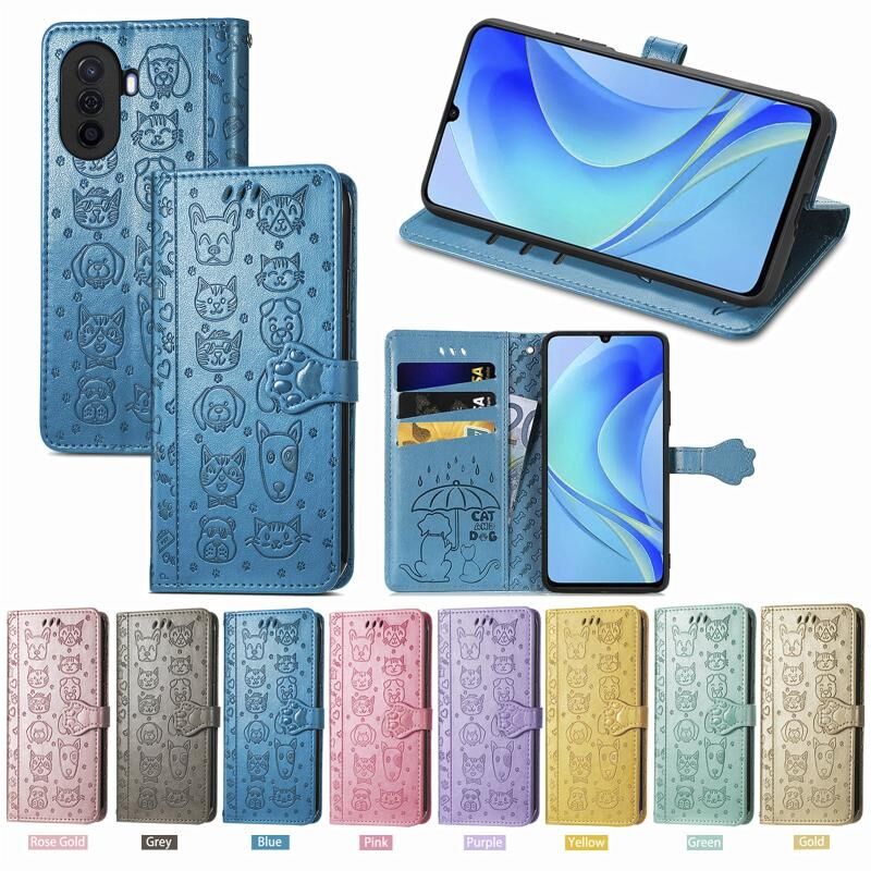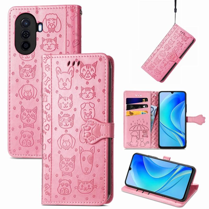 Θήκη τηλεφώνου από δέρμα με ανάγλυφα σχέδια χαριτωμένων γάτας και σκύλου για Huawei Enjoy 50 (Μωβ)