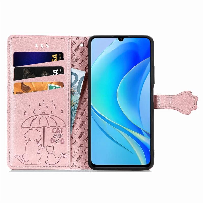 Θήκη τηλεφώνου από δέρμα με ανάγλυφα σχέδια χαριτωμένων γάτας και σκύλου για Huawei Enjoy 50 (Μωβ)