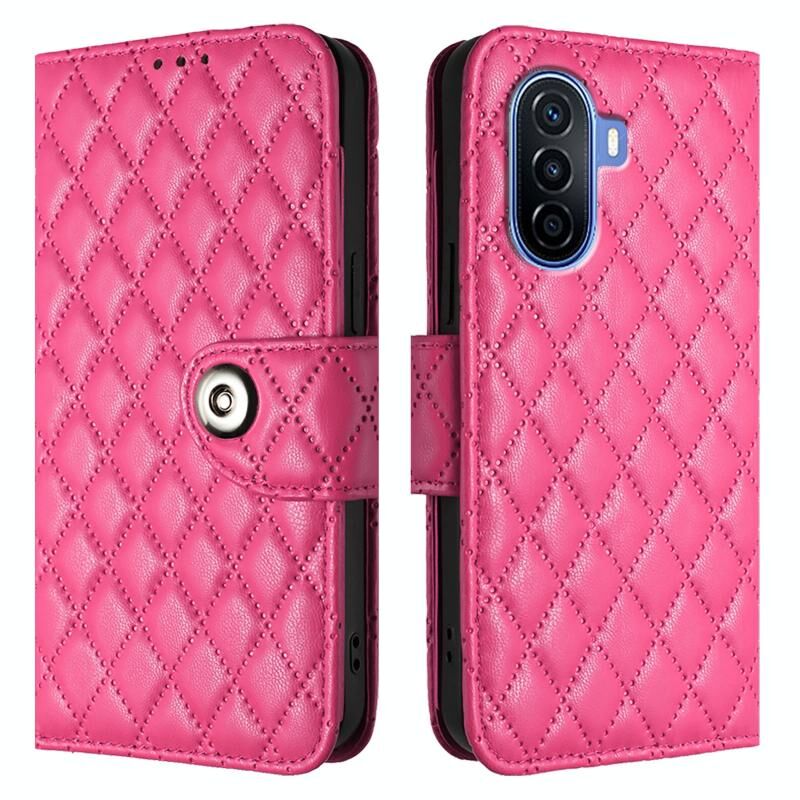Για Huawei Enjoy 50 / nova Y70 Plus Rhombic Υφή Flip υπόθεση τηλεφώνου δέρμα με κορδόνι (Rose Red)
