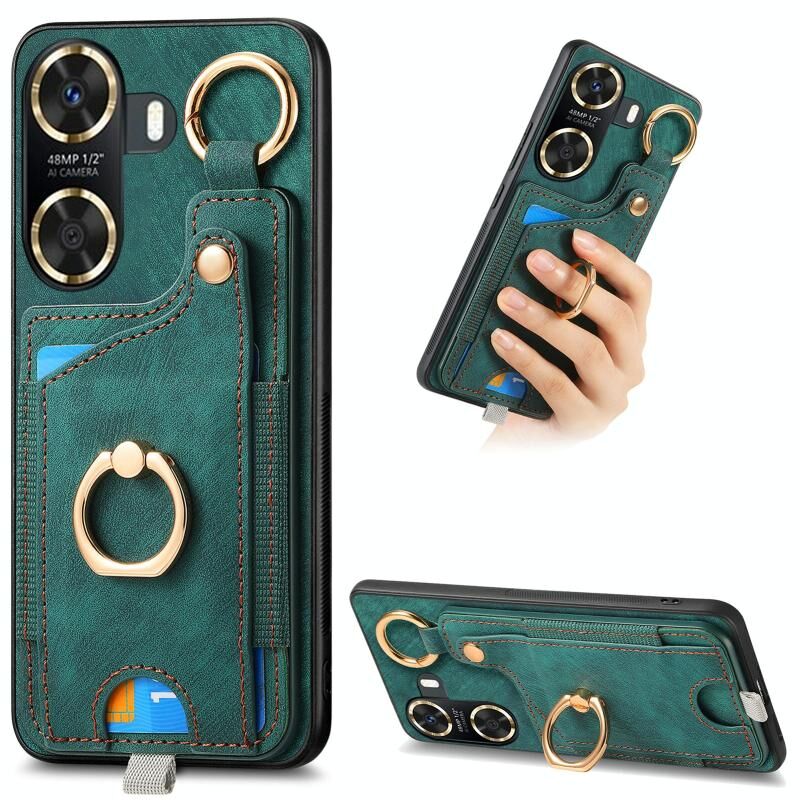Για Huawei Enjoy 60 Ρετρό δέρμα αίσθηση δαχτυλίδι κάρτα τσάντα υπόθεση τηλεφώνου με Hang Loop (Πράσινο)