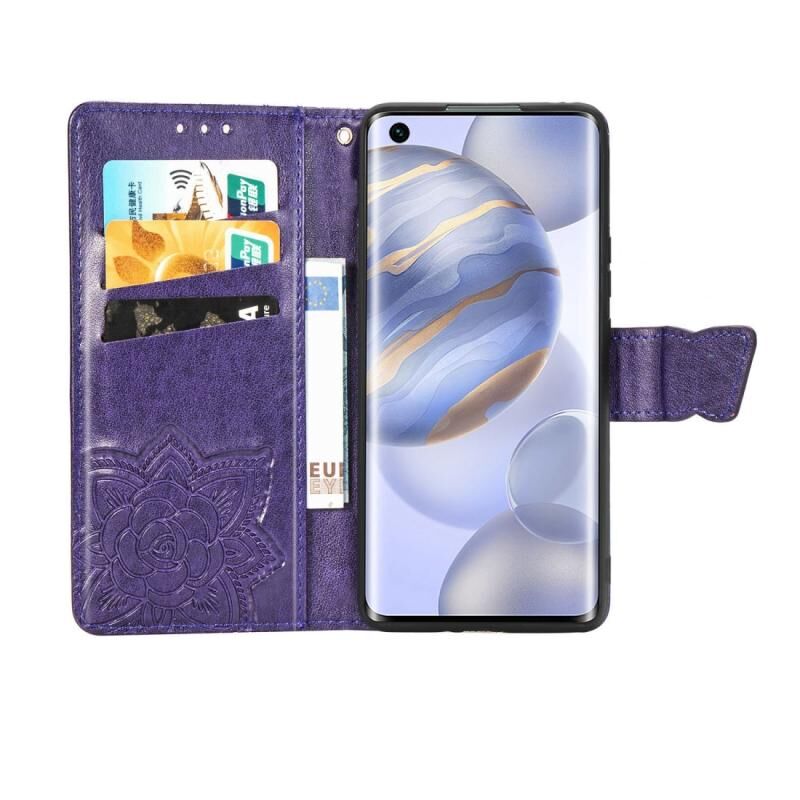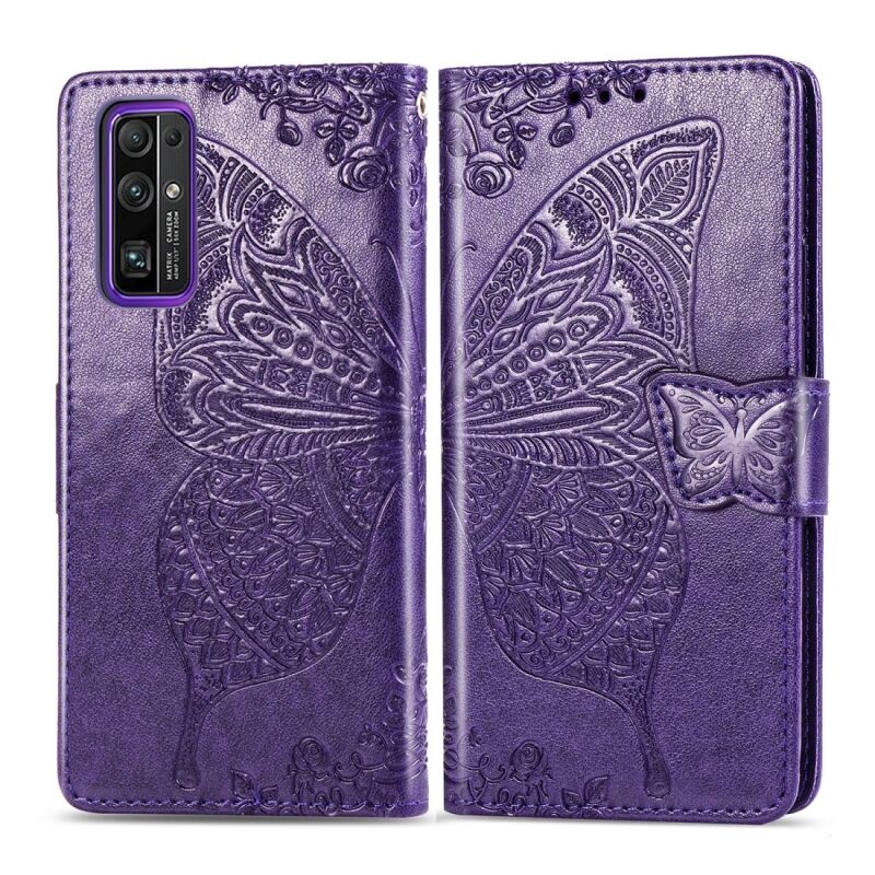 Για Huawei Honor 30 πεταλούδα αγάπη λουλούδι ανάγλυφο οριζόντια Flip δερμάτινη θήκη με βραχίονα / υποδοχή κάρτας / πορτοφόλι / Lanyard (σκούρο μωβ)