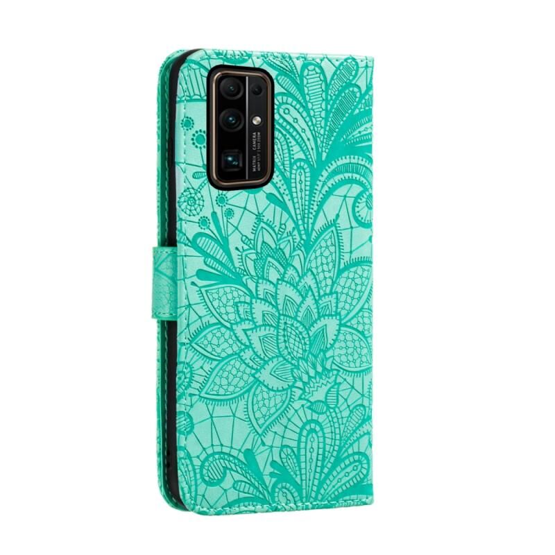 Θήκη δέρματος οριζόντιας αναδίπλωσης με σχέδιο δαντέλας λουλουδιών για Huawei Honor 30 Pro, με βάση στήριξης & υποδοχές καρτών & πορτοφόλι & κορνίζα φωτογραφιών & κορδόνι (Μωβ)