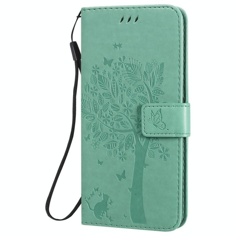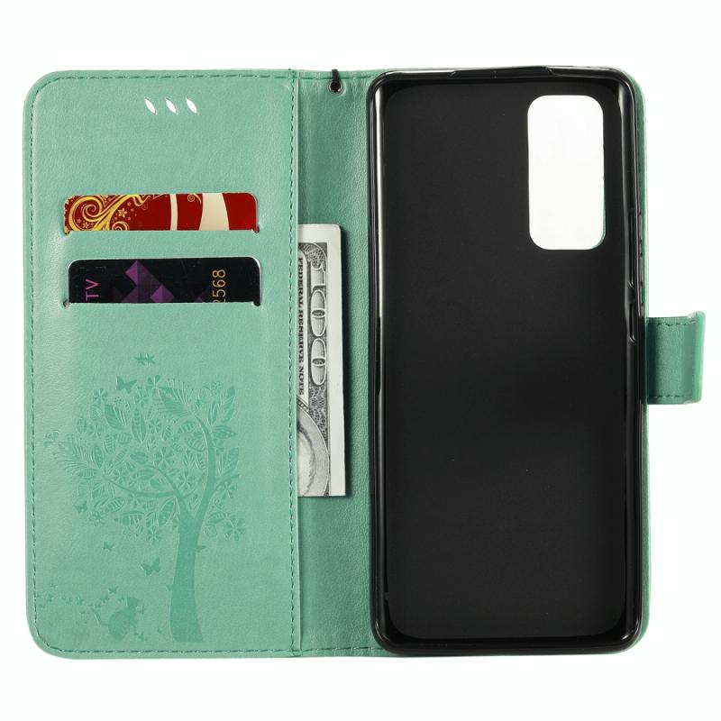 For Huawei Honor 30 Pro Tree & Cat Embossed Pattern Horizontal Flip Leather Case with Holder & Card Slots & Wallet & Lanyard(Green)