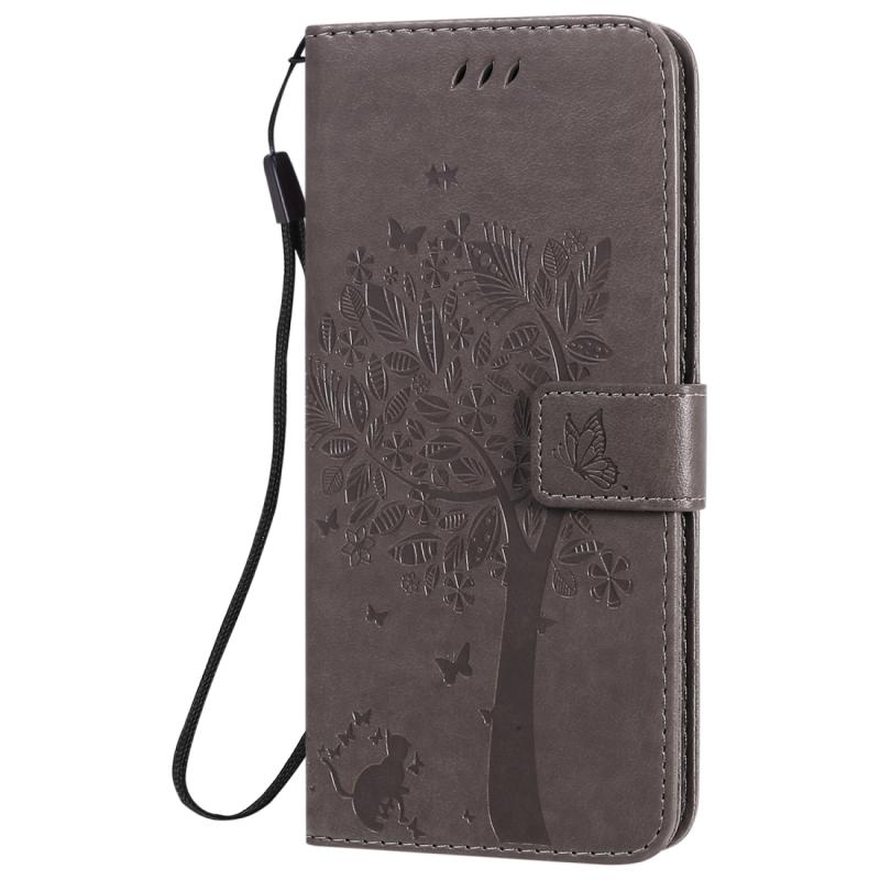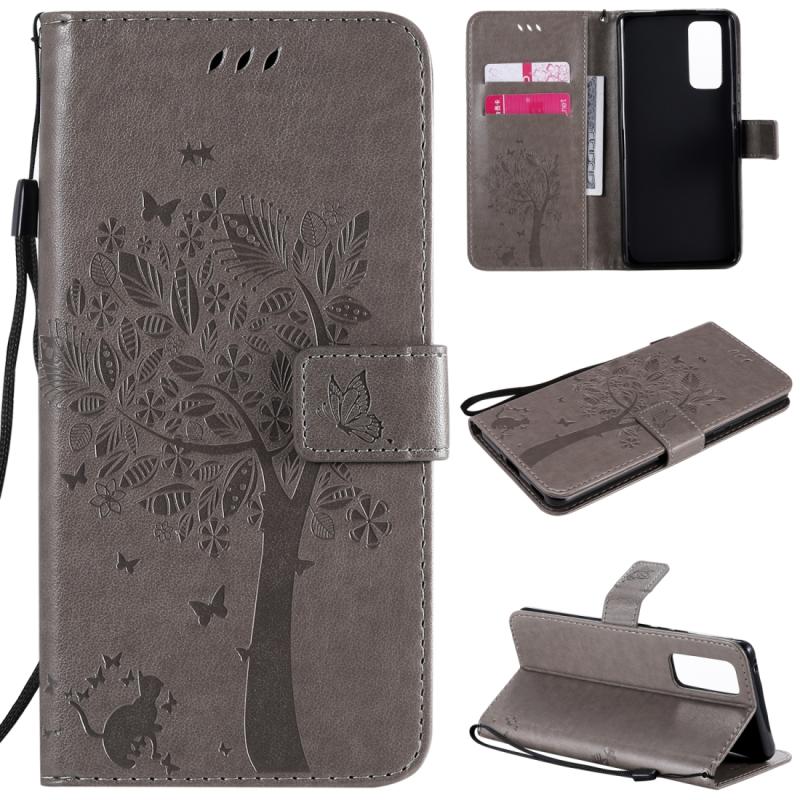 For Huawei Honor 30 Pro Tree & Cat Embossed Pattern Horizontal Flip Leather Case with Holder & Card Slots & Wallet & Lanyard(Grey)
