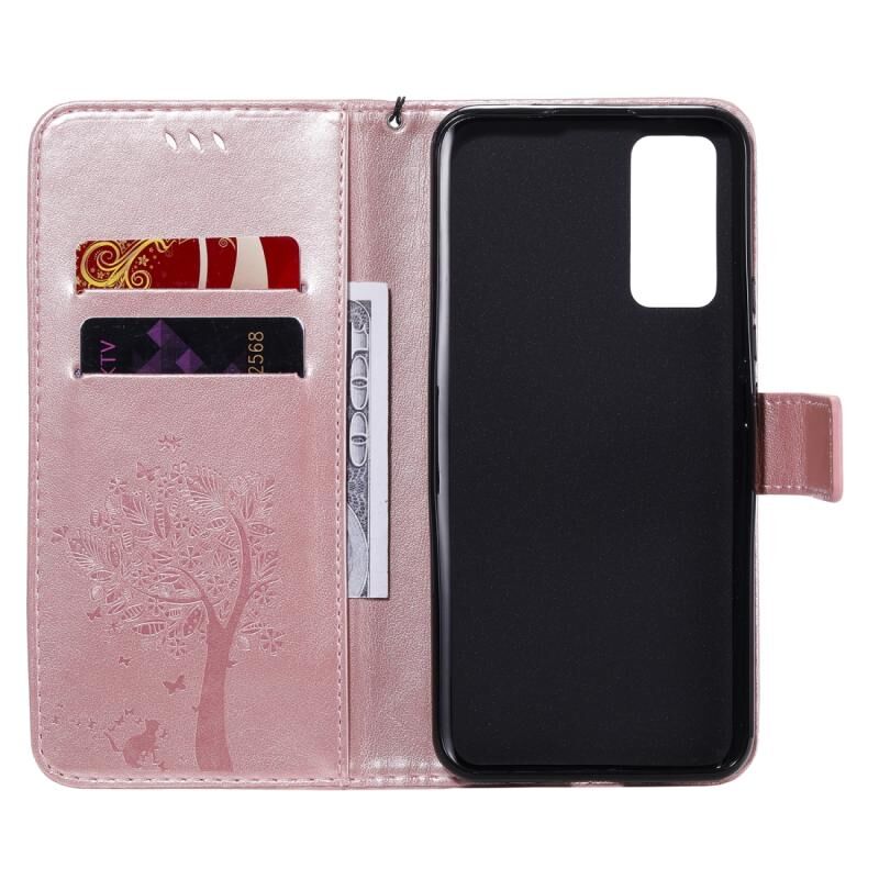 Για Huawei Honor 30 Tree & Cat ανάγλυφο μοτίβο οριζόντια Flip δερμάτινη θήκη με κάτοχο & υποδοχές για κάρτες & πορτοφόλι & κορδόνι (Rose Gold)