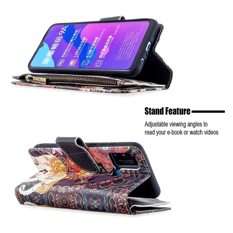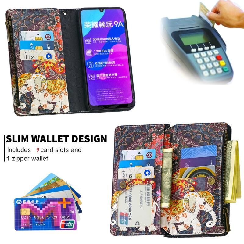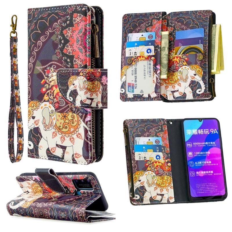 Θήκη Huawei Honor 9A με σχέδιο πολύχρωμης ζωγραφικής, οριζόντια, δερμάτινη με φερμουάρ, με βάση & θήκες για κάρτες & πορτοφόλι (Λουλούδια & Ελέφαντες)