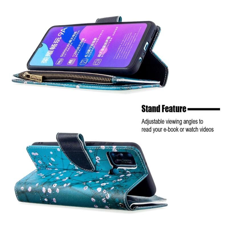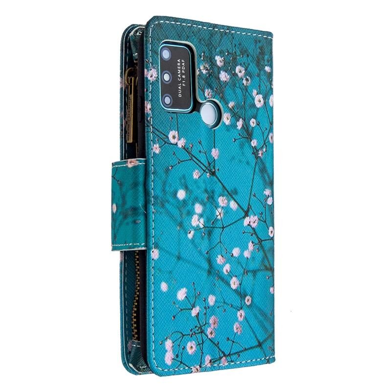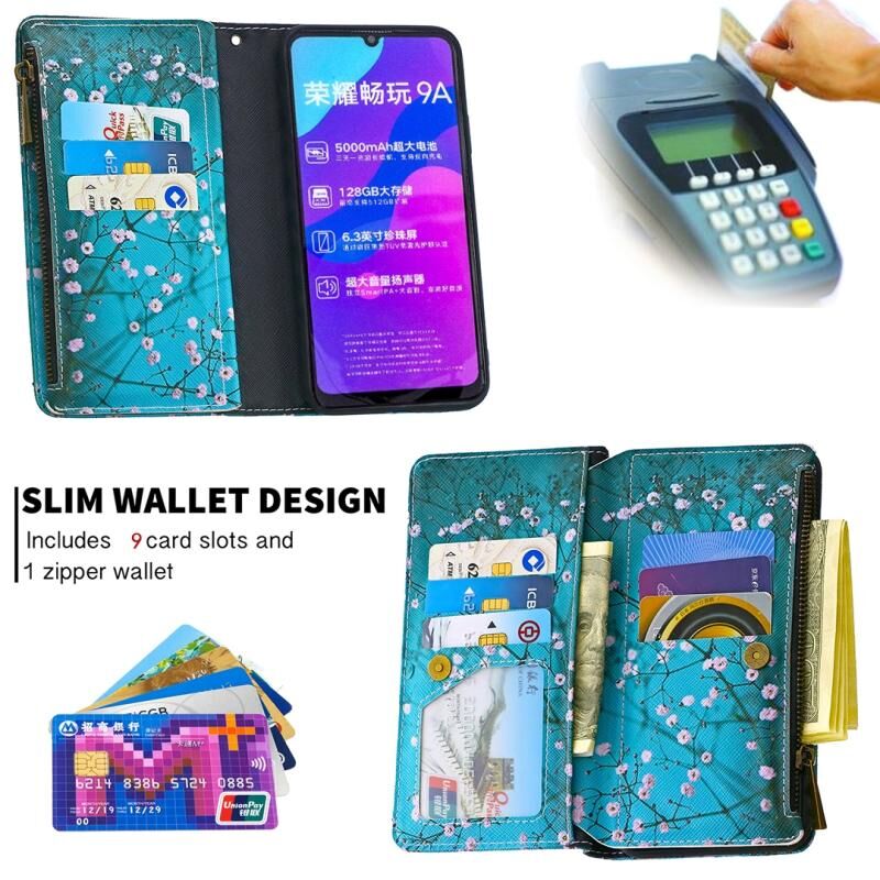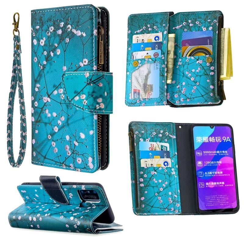 Θήκη Huawei Honor 9A με σχέδιο πολύχρωμης ζωγραφικής, οριζόντια, δερμάτινη με φερμουάρ, με βάση & θήκες για κάρτες & πορτοφόλι (Λουλούδι Δαμασκηνιάς)