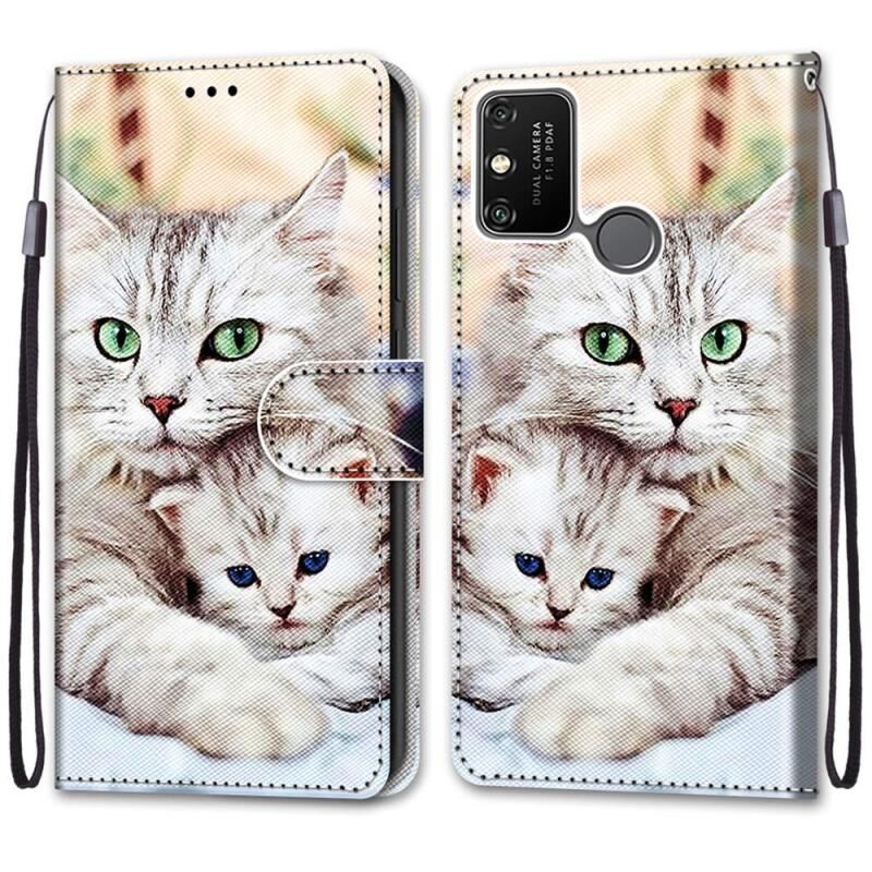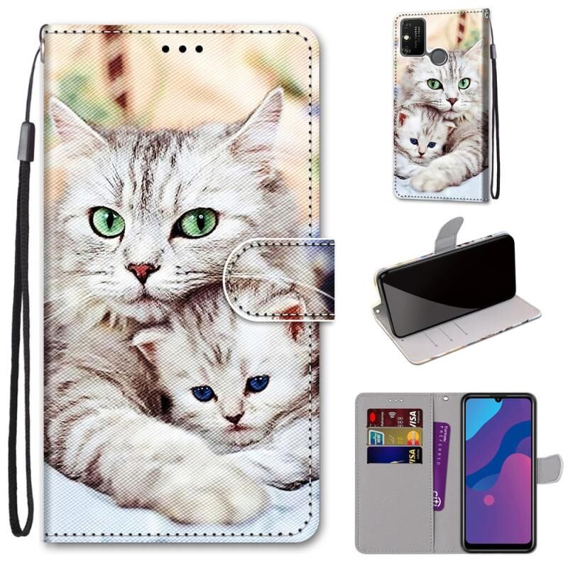 Θήκη Huawei Honor 9A με πολύχρωμο σχέδιο, υφή σταυρού, οριζόντια αναδίπλωση από δερματίνη PU με βάση στήριξης, θήκες για κάρτες, πορτοφόλι & λουρί (Μεγάλη γάτα που κρατάει γατάκι)