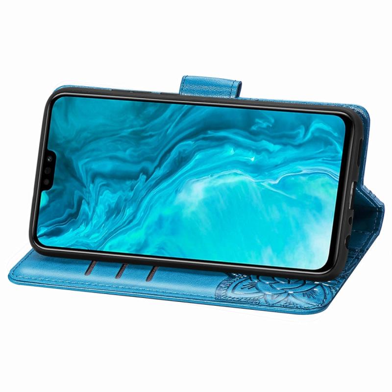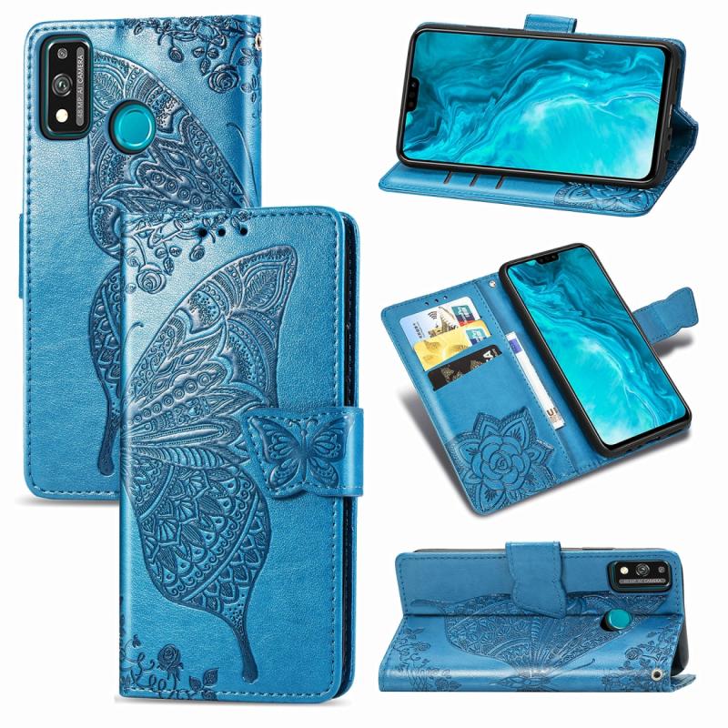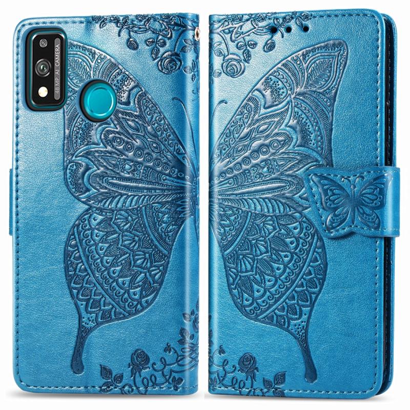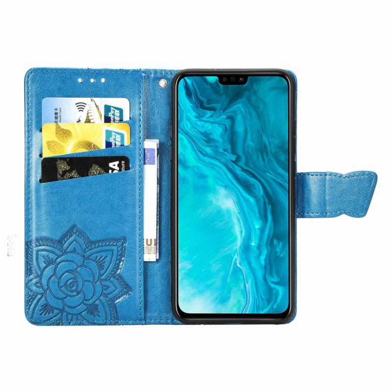 Θήκη Huawei Honor 9X Lite, με σχέδιο πεταλούδας και λουλουδιών, ανάγλυφη, οριζόντια, από δέρμα με βάση στήριξης / υποδοχή κάρτας / πορτοφόλι / κορδόνι (Μπλε)