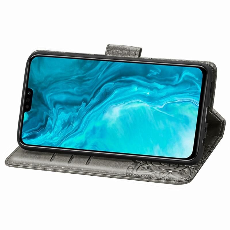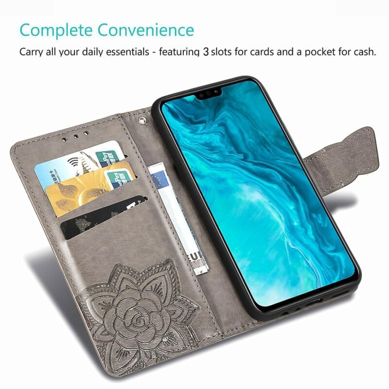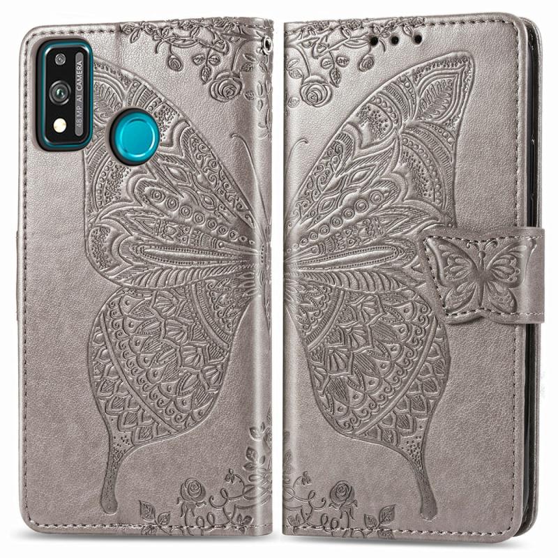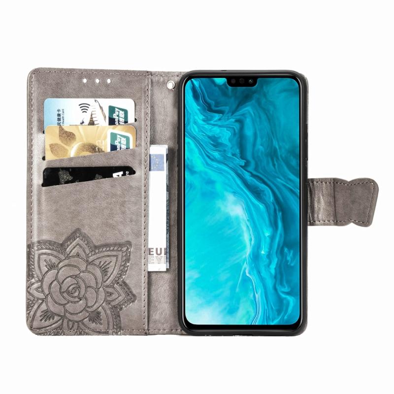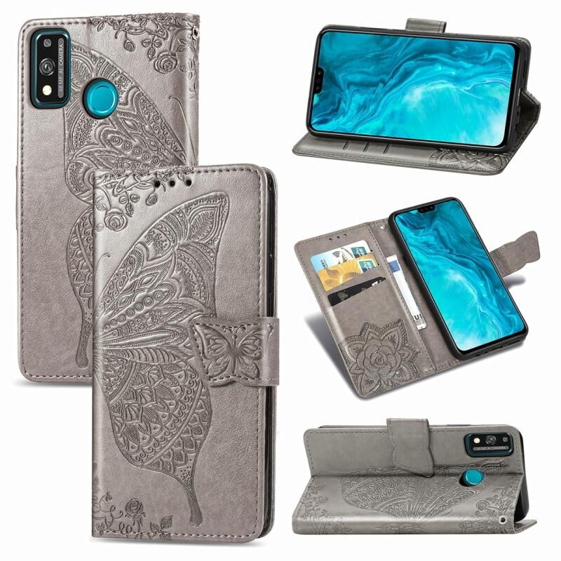 Θήκη Huawei Honor 9X Lite, με σχέδιο πεταλούδας και λουλουδιών, ανάγλυφη, οριζόντια, από δέρμα με βάση στήριξης / υποδοχή κάρτας / πορτοφόλι / κορδόνι (Γκρι)