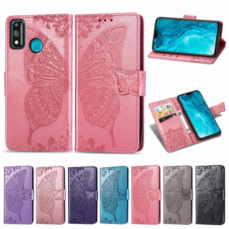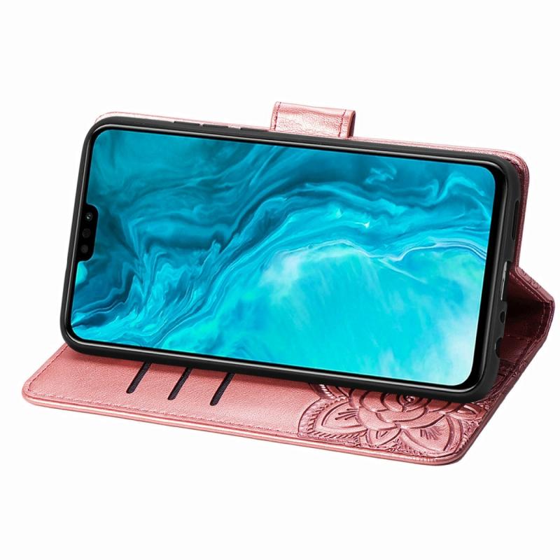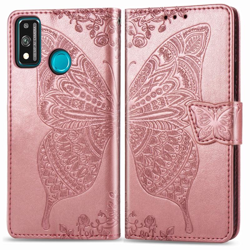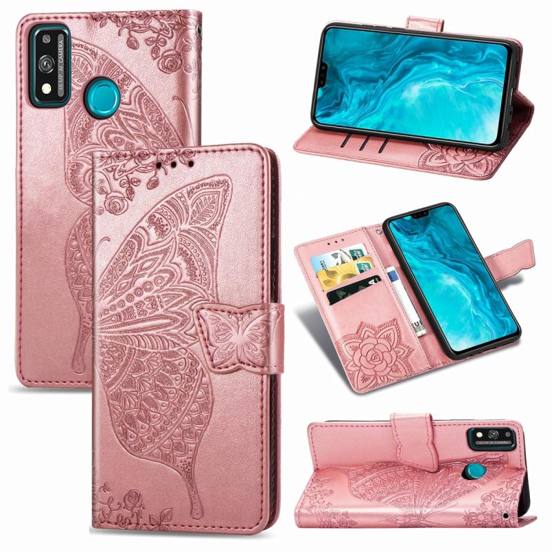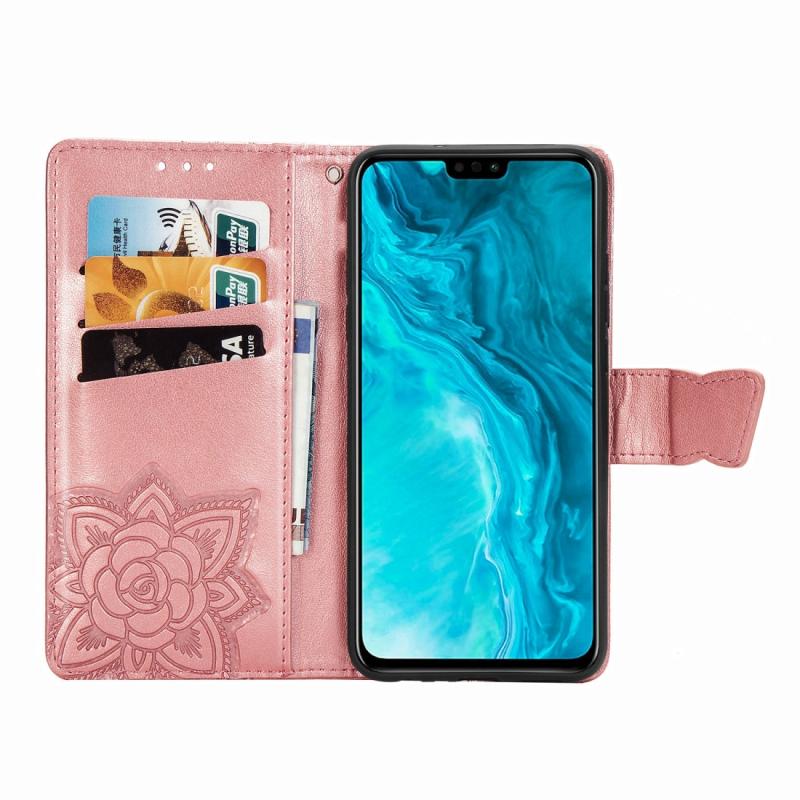 Θήκη Huawei Honor 9X Lite, με σχέδιο πεταλούδας και λουλουδιών, ανάγλυφη, οριζόντια, από δέρμα με βάση στήριξης / υποδοχή κάρτας / πορτοφόλι / κορδόνι (Ροζ χρυσός)