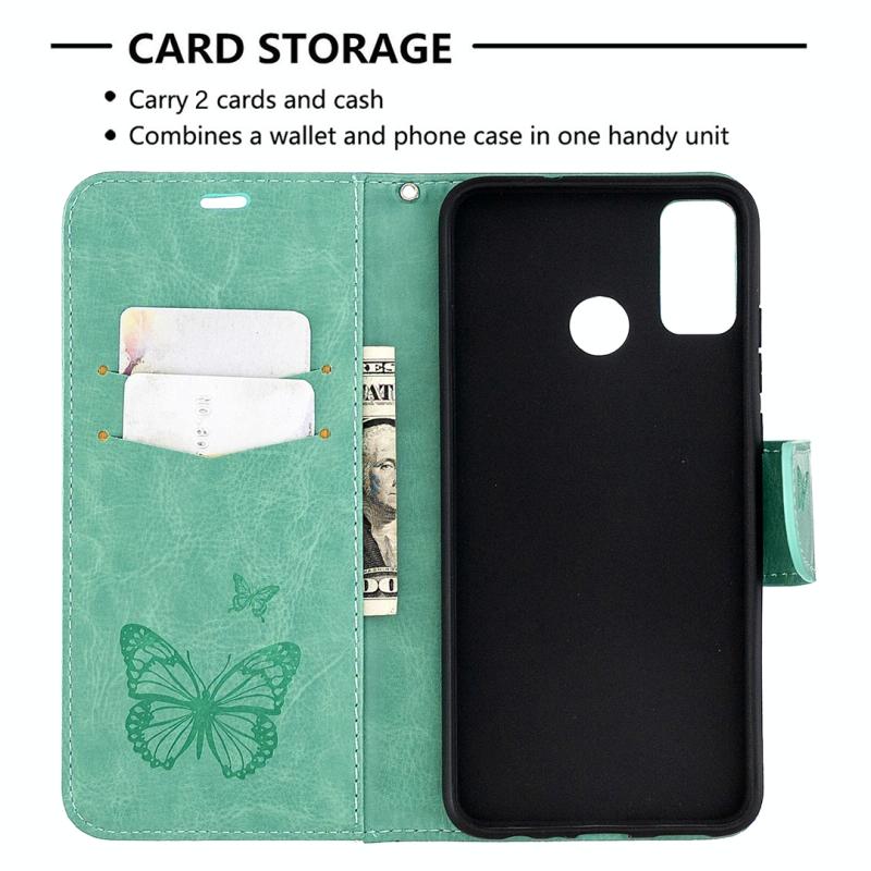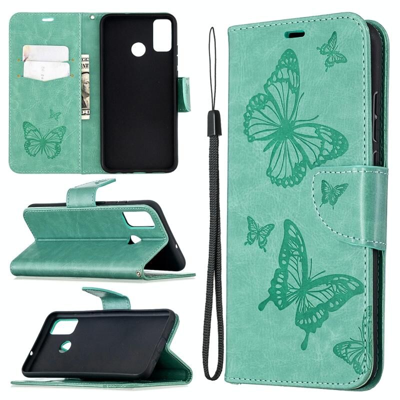 For Huawei Honor 9X Lite Two Butterflies Embossing Pattern Horizontal Flip Leather Case with Holder & Card Slot & Wallet & Lanyard(Green)