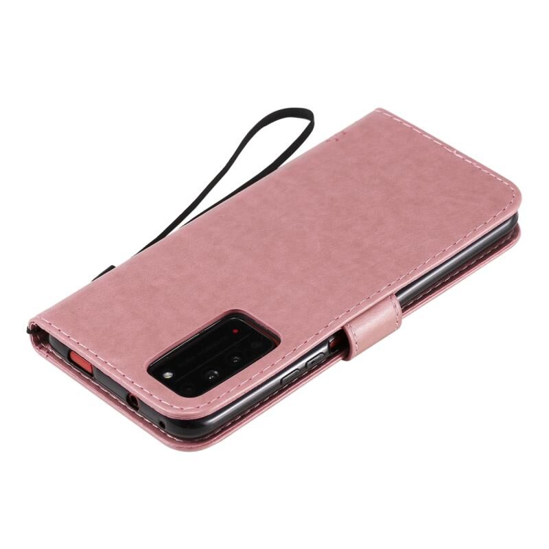 Θήκη δέρματος οριζόντιας αναδίπλωσης για Huawei Honor X10 5G με ανάγλυφο σχέδιο δέντρου & γάτας, με βάση στήριξης & θήκες καρτών & πορτοφόλι & κορδόνι (Μωβ)
