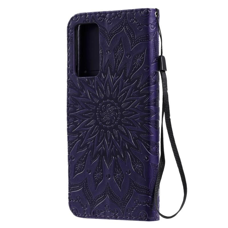 Για Huawei Honor X10 Πιεσμένη εκτύπωση ηλιοτρόπιο μοτίβο οριζόντια Flip PU δέρμα θήκη κάτοχος & υποδοχές καρτών & πορτοφόλι & Lanyard (μωβ)