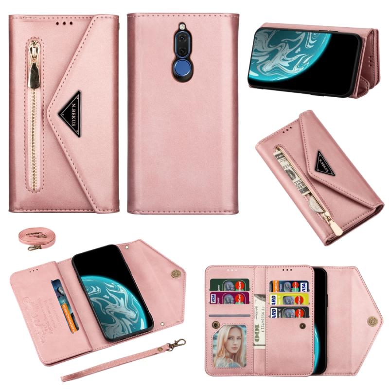 For Huawei Mate 10 Lite Skin Feel Zipper Horizontal Flip Leather Case with Holder & Card Slots & Photo Frame & Lanyard & Long Rope(Rose Gold)