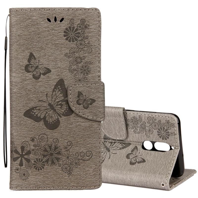 Θήκη Huawei Mate 10 Lite Vintage με ανάγλυφο floral σχέδιο πεταλούδας, οριζόντια, από δέρμα με θήκη για κάρτες, στήριξη, πορτοφόλι και κορδόνι (Γκρι)